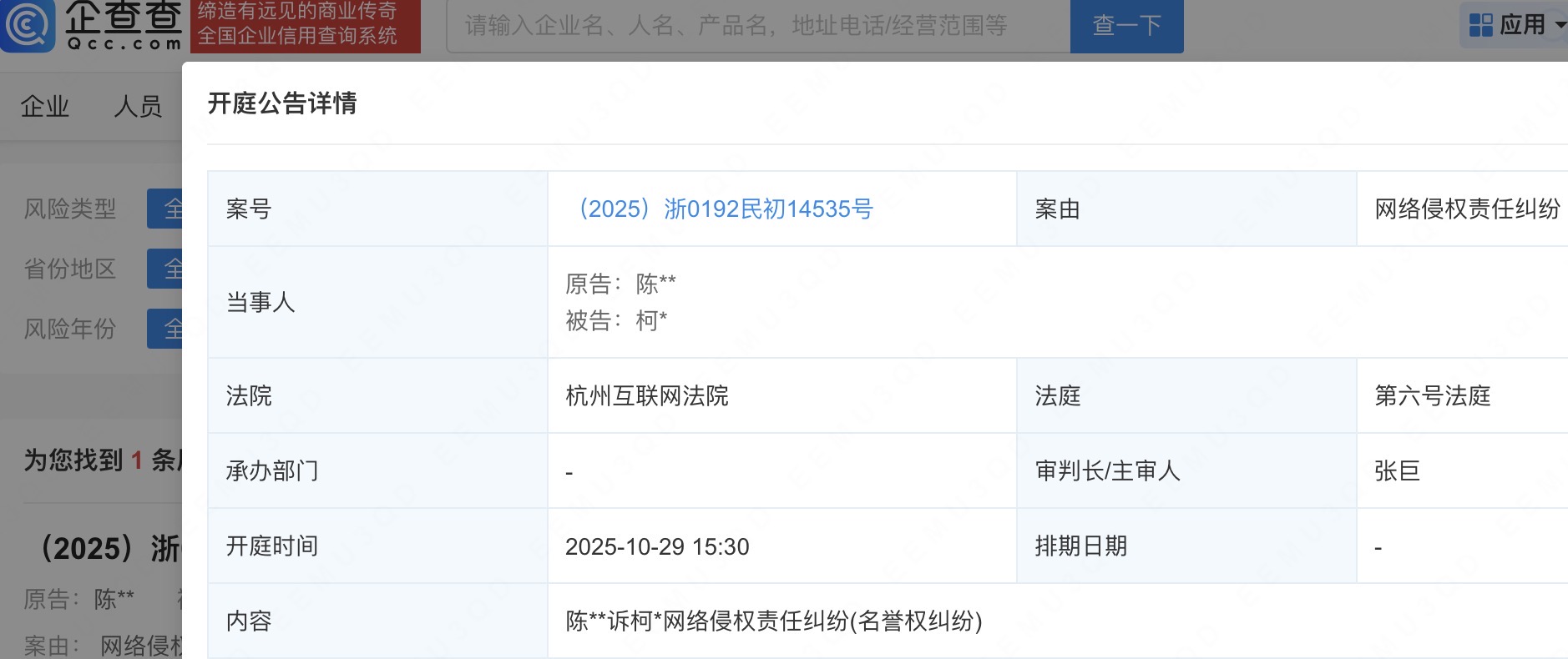 此前,陈丽君曾多次发起维权诉讼,被告包括周某、柯某等,上述两案件已分别于10月28日、10月29日在杭州互联网法院开庭审理。
