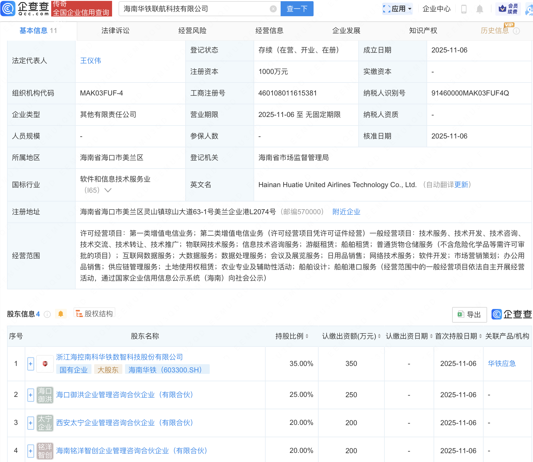 企查查APP显示,近日,海南华铁联航科技有限公司成立,注册资本1000万元,经营范围包含:物联网技术服务;信息技术咨询服务;互联网数据服务;大数据服务等。企查查股权穿透显示,该公司由海南华铁(603300)等共同持股。