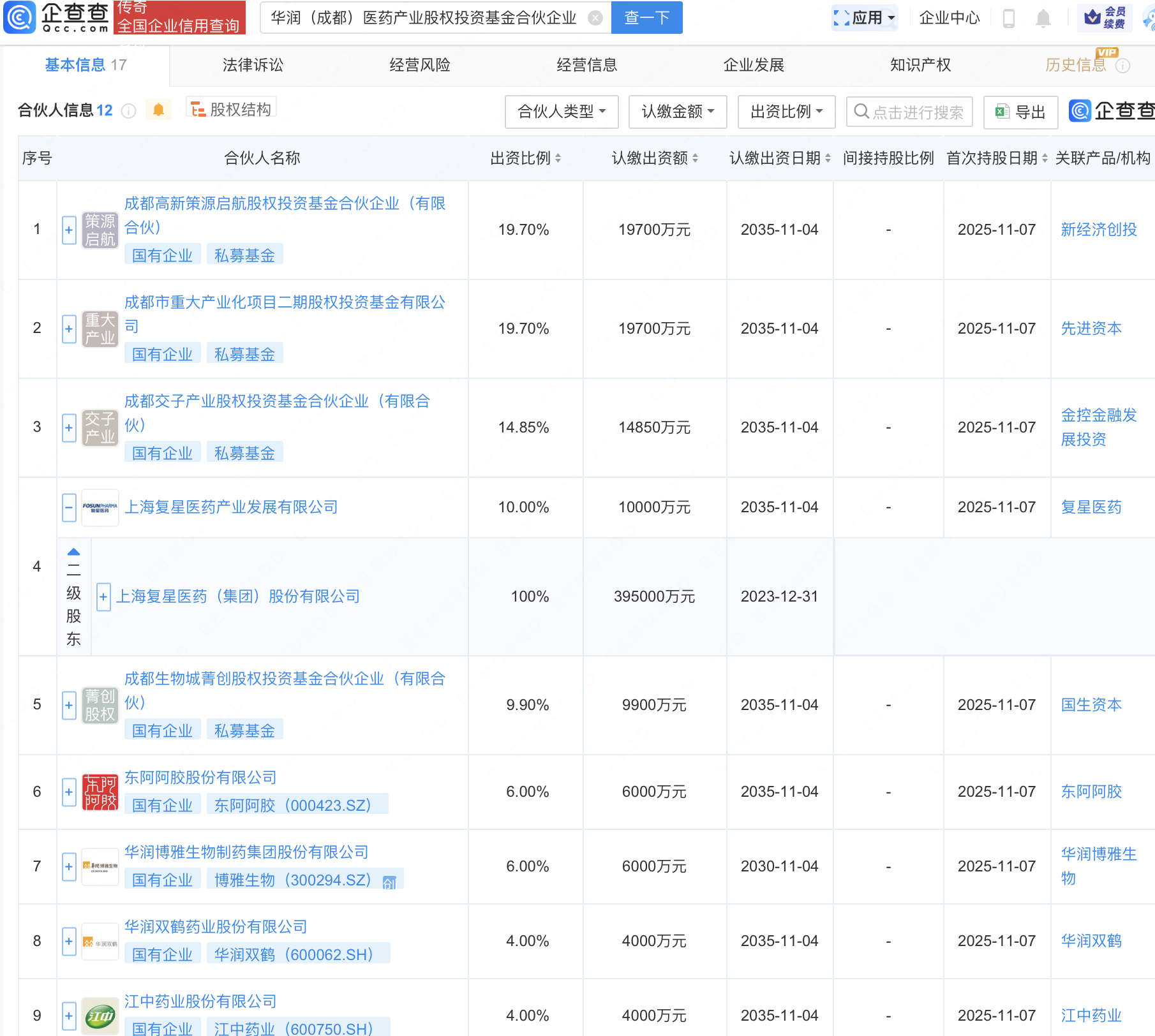 企查查APP显示,近日,华润(成都)医药产业股权投资基金合伙企业(有限合伙)成立,出资额10亿元,经营范围包含:创业投资(限投资未上市企业)。企查查股权穿透显示,该企业由复星医药(600196)全资子公司上海复星医药产业发展有限公司、东阿阿胶(000423)、博雅生物(300294)、华润双鹤(600062)、江中药业(600750)等共同出资。