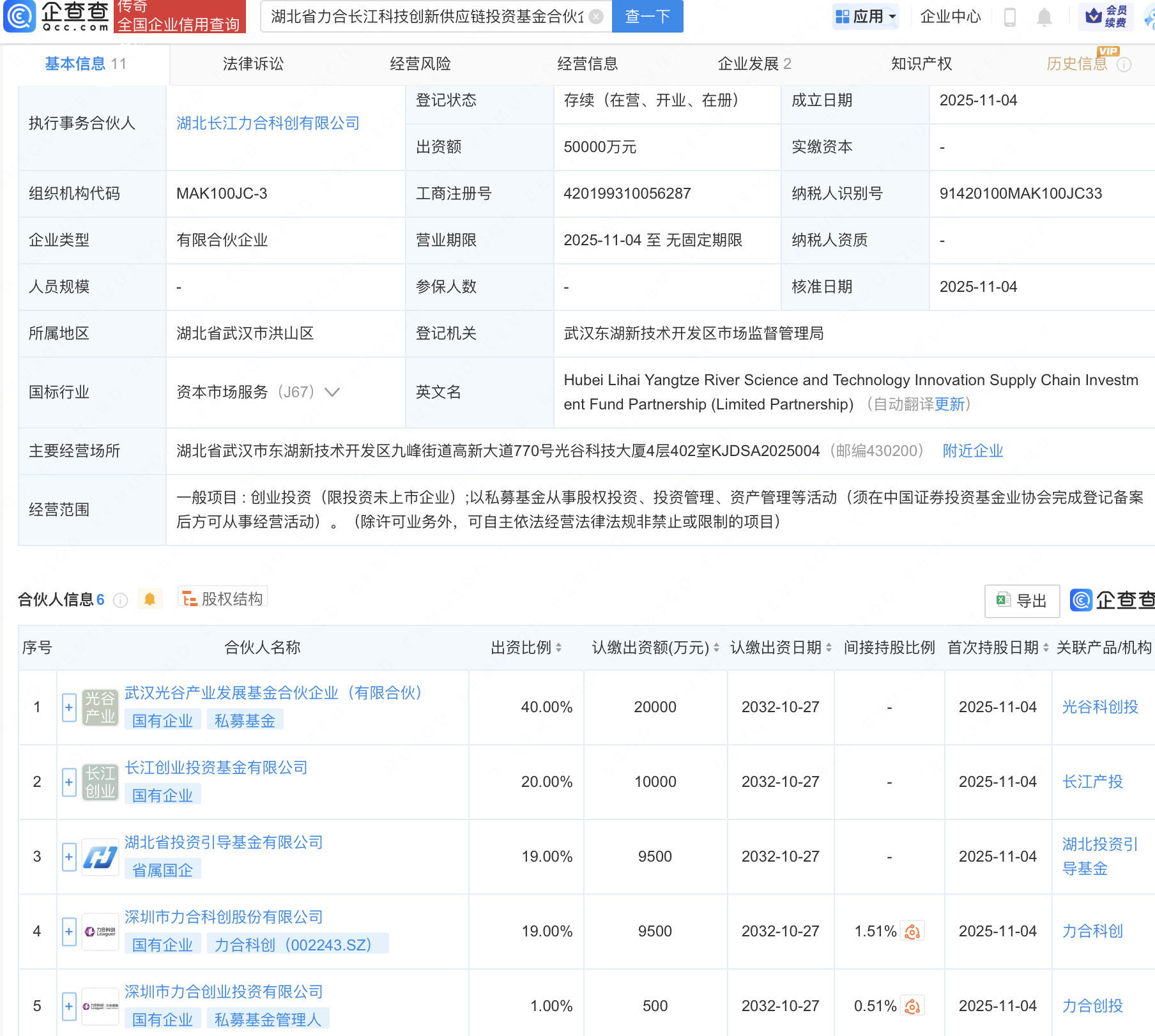 企查查APP显示,近日,湖北省力合长江科技创新供应链投资基金合伙企业(有限合伙)成立,出资额5亿元,经营范围包含:创业投资(限投资未上市企业);以私募基金从事股权投资、投资管理、资产管理等活动。企查查股权穿透显示,该企业由力合科创(002243)、湖北省投资引导基金有限公司等共同出资。