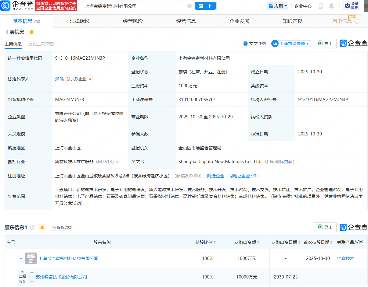 企查查APP显示,近日,上海金锦富新材料有限公司成立,法定代表人为张锐,注册资本为1000万元,经营范围包含:新材料技术研发;电子专用材料研发;电子产品销售;石墨及碳素制品销售;石墨烯材料销售等。企查查股权穿透显示,该公司由锦富技术(300128)间接全资持股。