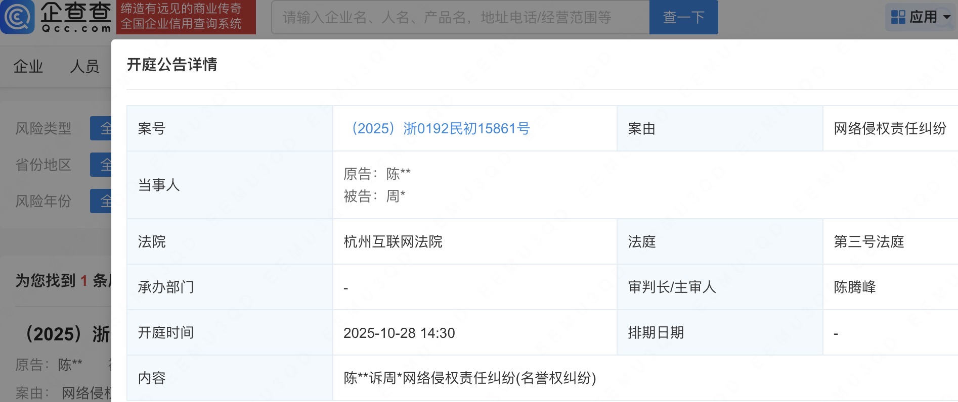 企查查APP显示,近日,杭州互联网法院向陈某公告送达陈丽君与其网络侵权责任纠纷案件起诉状及证据副本、开庭传票等诉讼文书,自公告之日起满30日即视为送达,并定于11月11日开庭审理。