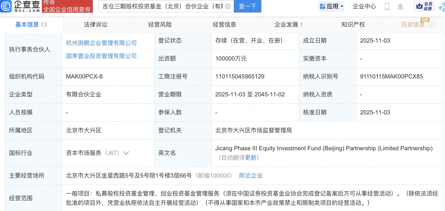 企查查APP显示,近日,吉仓三期股权投资基金(北京)合伙企业(有限合伙)成立,出资额10亿元,经营范围包含:私募股权投资基金管理、创业投资基金管理服务。企查查股权穿透显示,该企业由申通快递(002468)全资子公司上海申彻供应链管理有限公司、菜鸟网络科技有限公司旗下杭州游鹏企业管理有限公司、友邦人寿保险有限公司等共同出资。