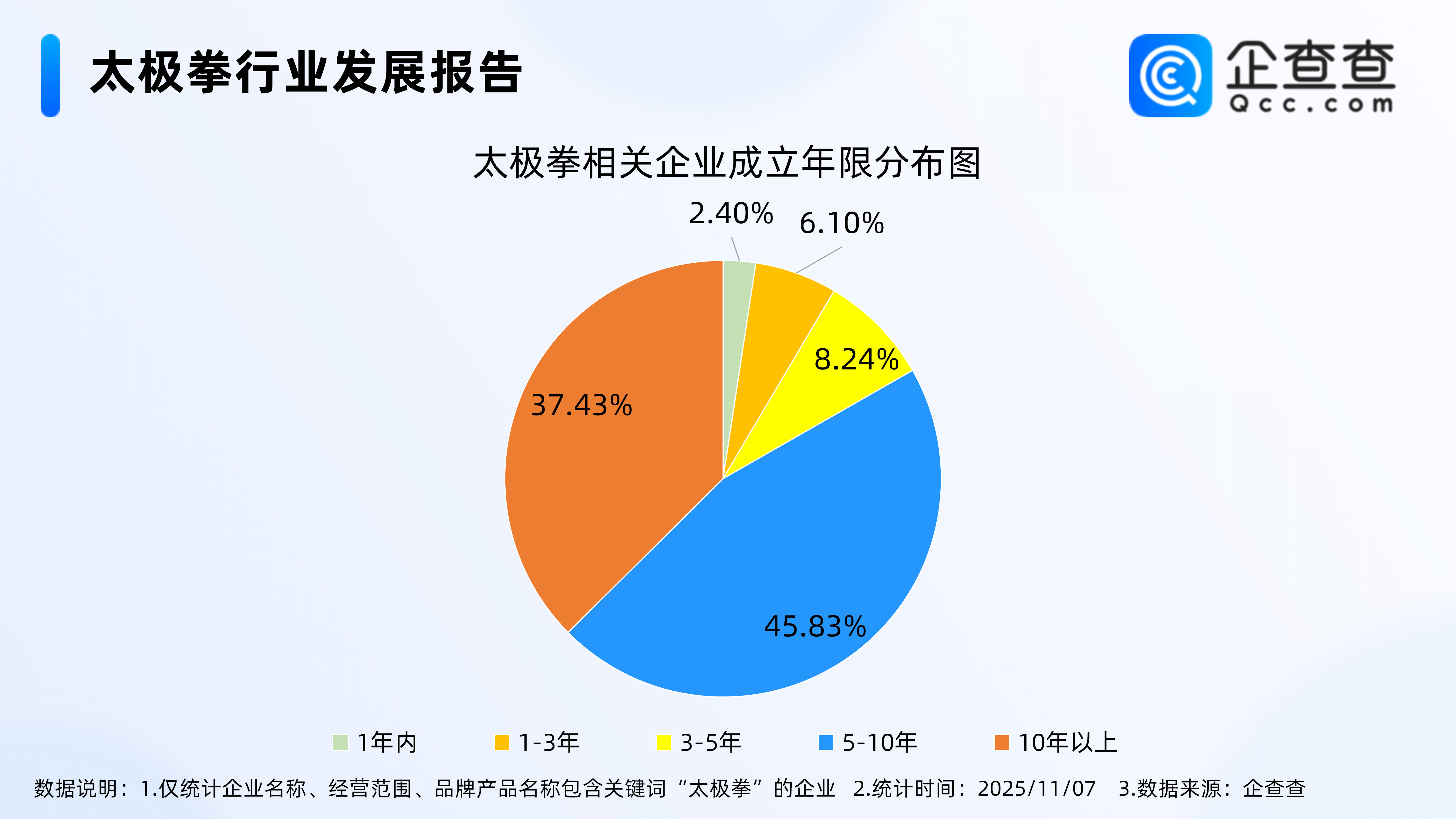 企查查数据显示,截至11月7日,国内现存太极拳相关企业3809家。存量方面,从经营时间来看,太极拳相关企业多为老牌企业,成立年限在5-10年的相关企业最多,占比45.83%。其次,成立年限在10年以上的相关企业占比37.43%。注册量方面,2024年全年注册127家相关企业,截至目前,今年已注册70家。