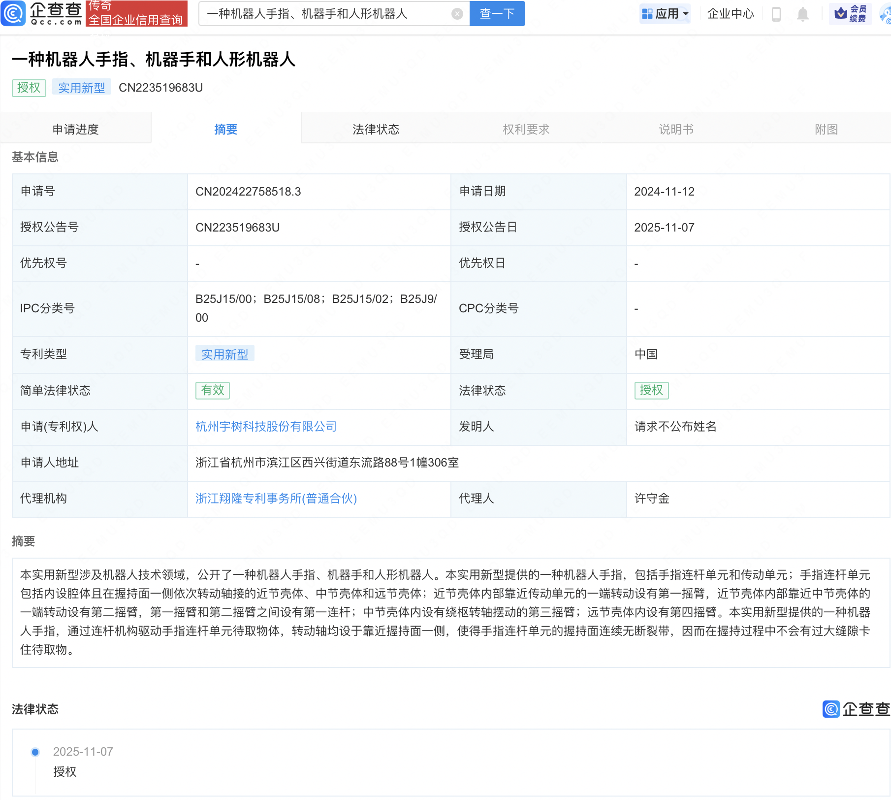 企查查APP显示,近日,杭州宇树科技股份有限公司“一种机器人手指、机器手和人形机器人”专利获授权。企查查专利摘要显示,本实用新型提供的一种机器人手指,包括手指连杆单元和传动单元;手指连杆单元包括内设腔体且在握持面一侧依次转动轴接的近节壳体、中节壳体和远节壳体;近节壳体内部靠近传动单元的一端转动设有第一摇臂,近节壳体内部靠近中节壳体的一端转动设有第二摇臂,第一摇臂和第二摇臂之间设有第一连杆;中节壳体内设有绕枢转轴摆动的第三摇臂;远节壳体内设有第四摇臂。