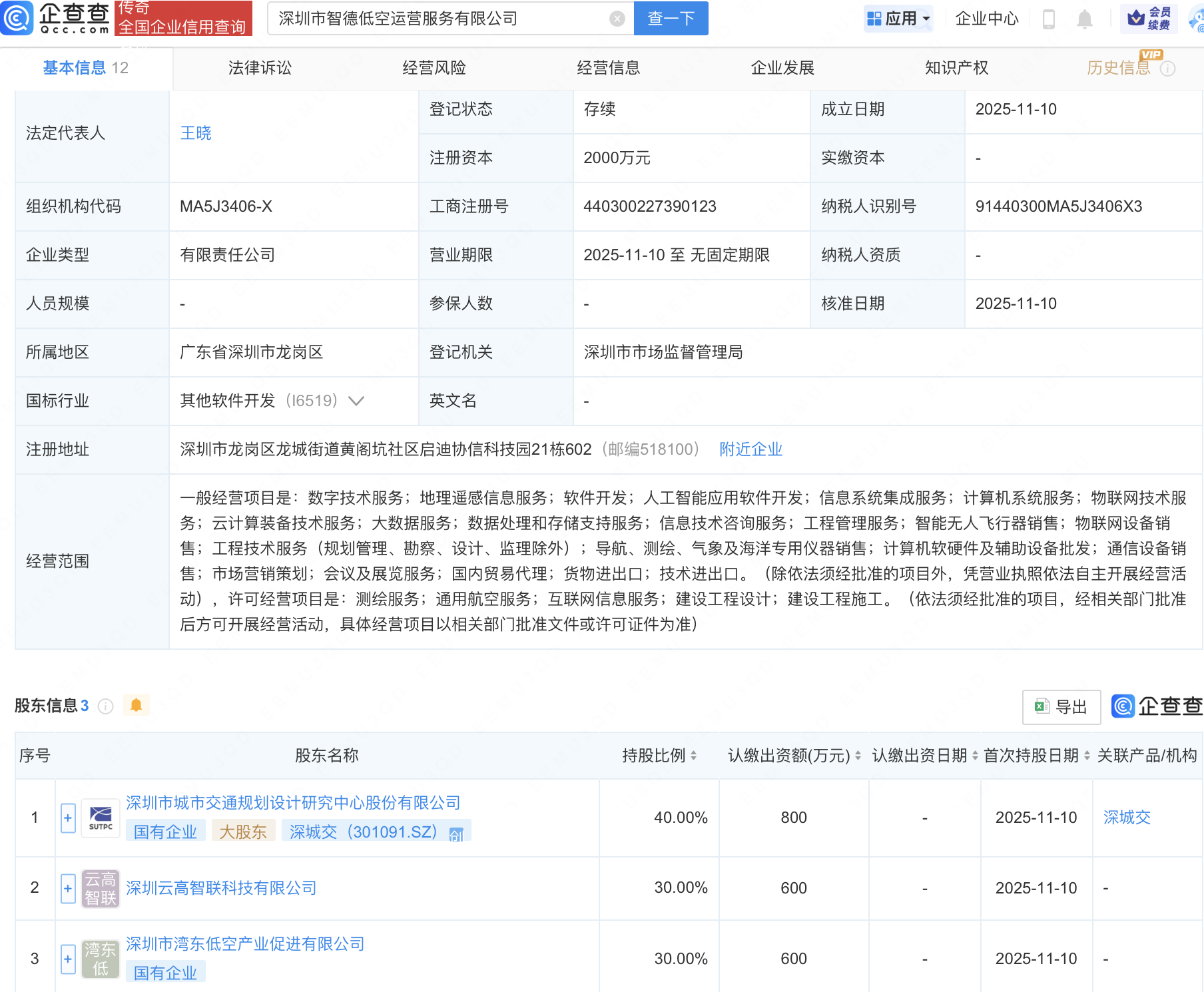 企查查APP显示,近日,深圳市智德低空运营服务有限公司成立,注册资本2000万元,经营范围包含:人工智能应用软件开发;智能无人飞行器销售;物联网设备销售;互联网信息服务等。企查查股权穿透显示,该公司由深城交(301091)等共同持股。