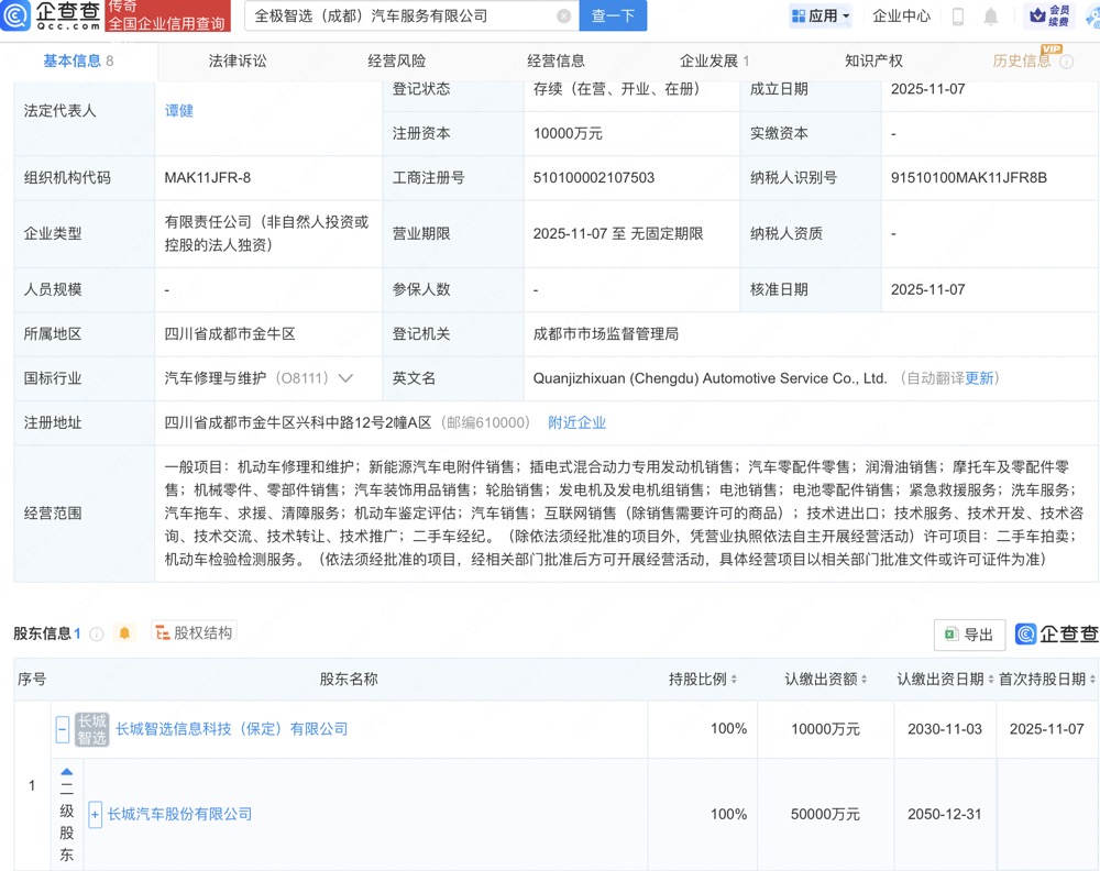 企查查APP显示,近日,全极智选(成都)汽车服务有限公司成立,法定代表人为谭健,注册资本1亿人民币,经营范围含机动车修理和维护、新能源汽车电附件销售、插电式混合动力专用发动机销售等。企查查股权穿透显示,该公司由长城汽车(601633)间接全资持股。