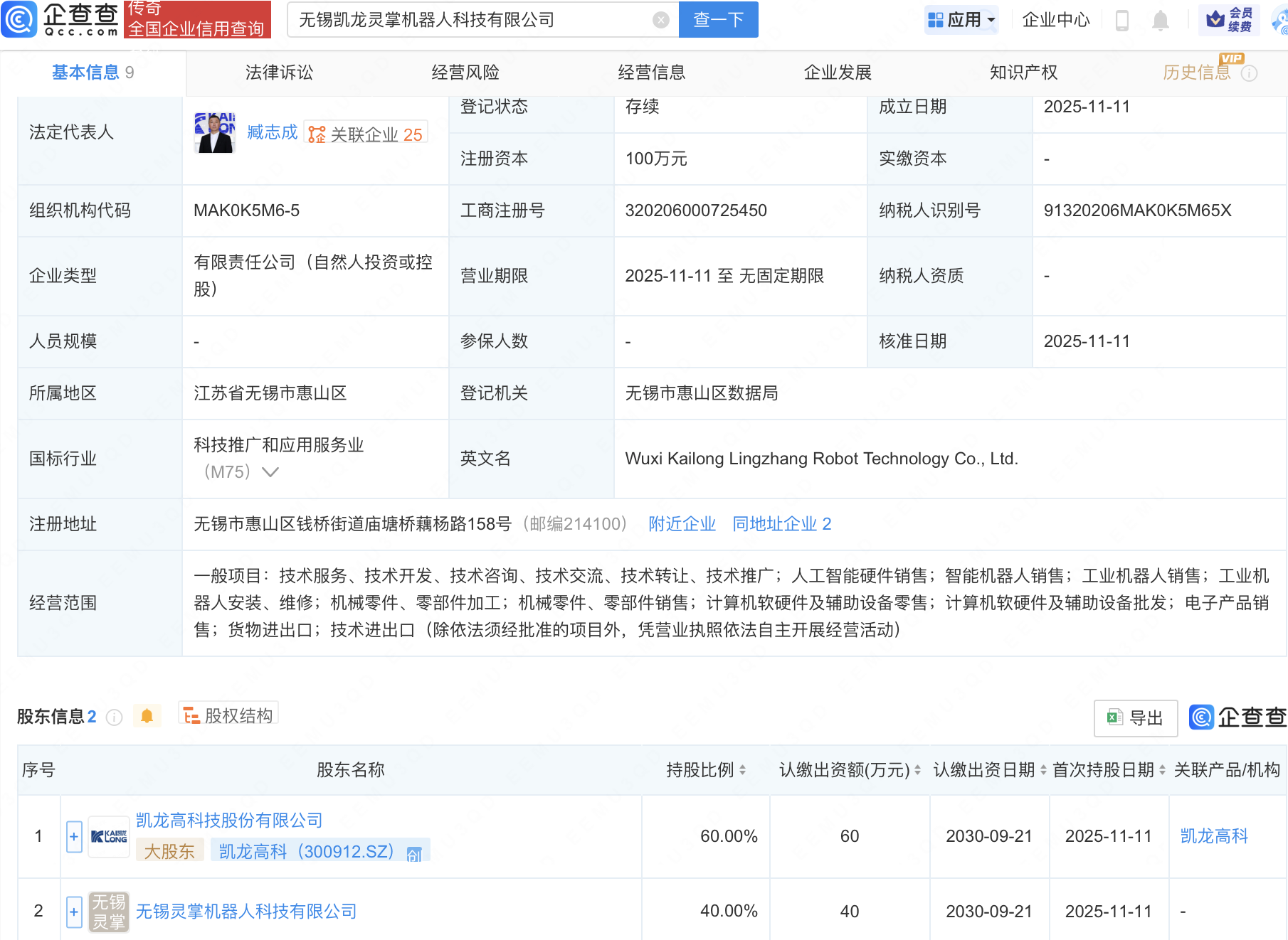 企查查APP显示,近日,无锡凯龙灵掌机器人科技有限公司成立,法定代表人为臧志成,经营范围包含:人工智能硬件销售;智能机器人销售;工业机器人销售;工业机器人安装、维修等。企查查股权穿透显示,该公司由凯龙高科(300912)等共同持股。此前,凯龙高科等成立无锡市凯奇具身智能机器人科技有限公司。