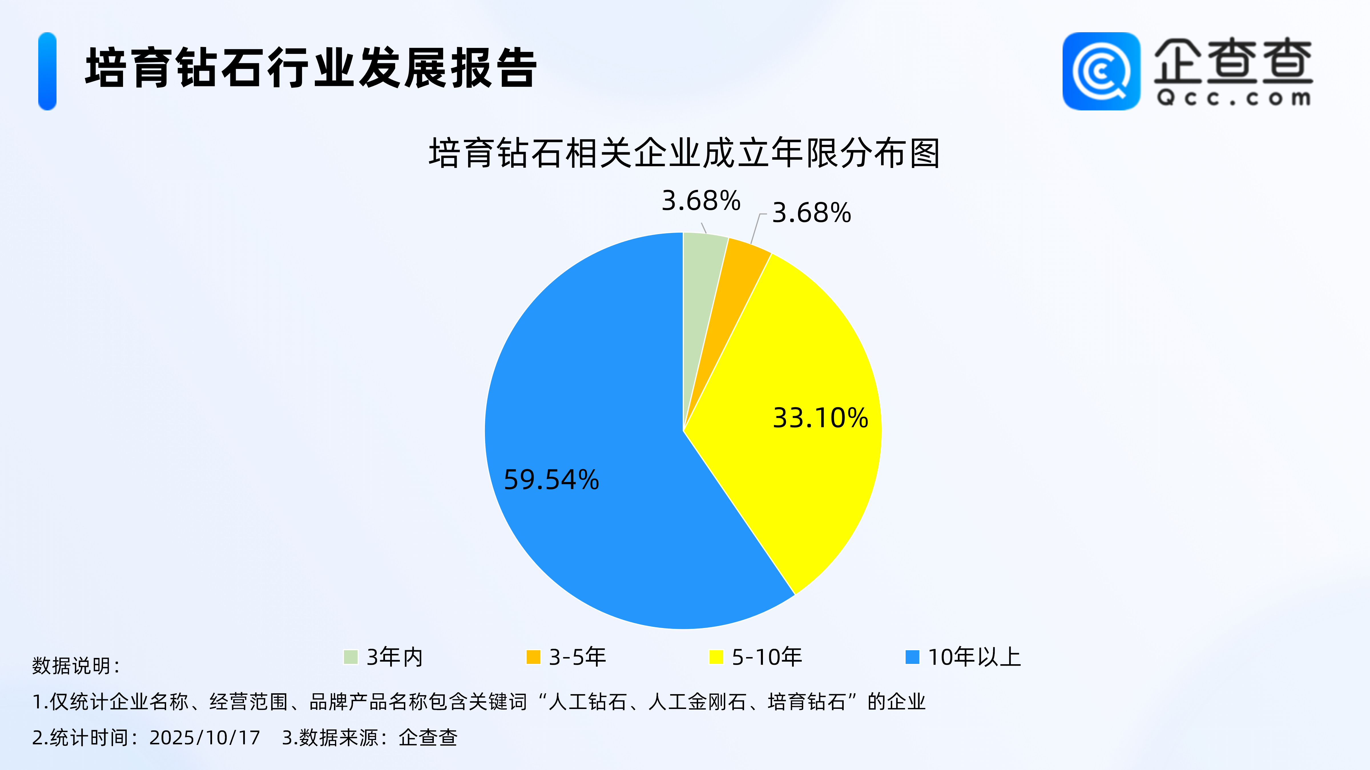 企查查数据显示,国内现存培育钻石相关企业873家。从经营时间来看,培育钻石相关企业多为老牌企业,成立年限在10年以上的企业近六成,占比达59.54%。其次,成立年限在5-10年的相关企业占比33.10%。注册量方面,2024年全年注册15家相关企业,截至目前,今年已注册7家。