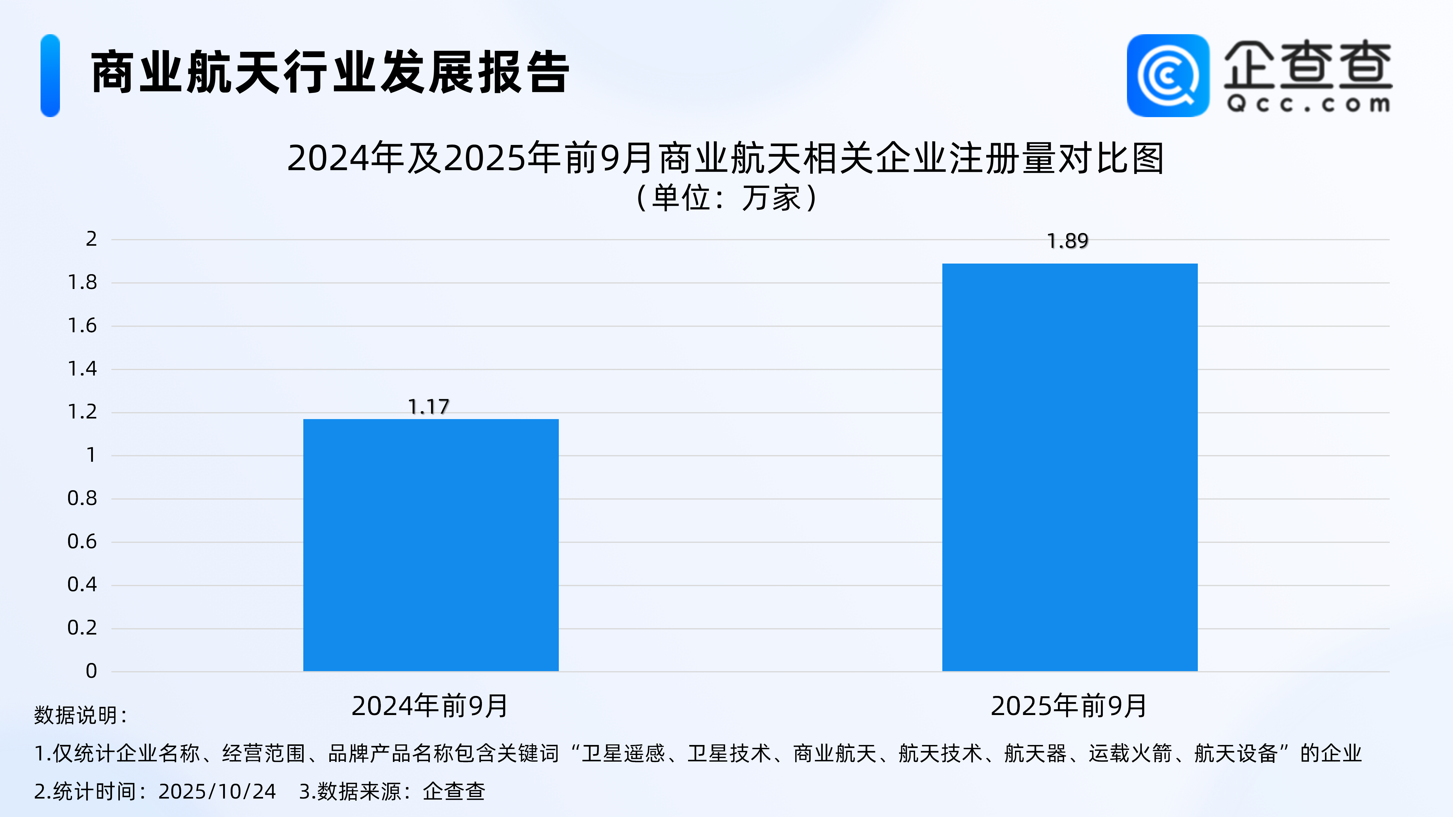 企查查数据显示,国内现存商业航天相关企业8.82万家。近十年相关企业注册量呈整体增长态势,2024年全年注册相关企业1.64万家,截至目前,今年已注册2万家相关企业,远超去年全年注册量,其中前9月注册1.89万家,同比增长62.30%。
