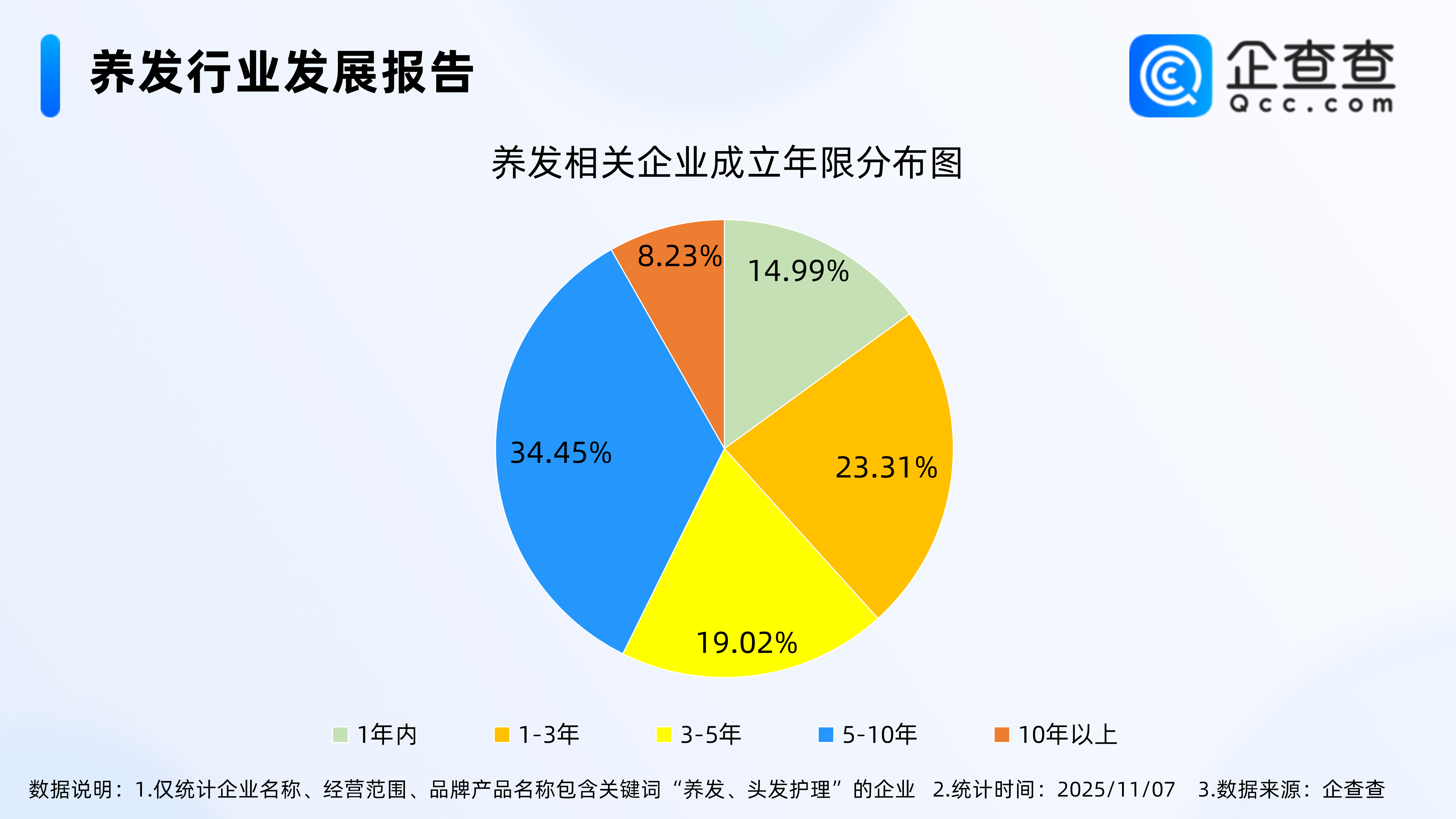 企查查数据显示,从经营时间来看,成立年限在5-10年的养发相关企业最多,占比34.45%。其次,成立年限在1-3年、3-5年的养发相关企业分别占比23.31%、19.02%。
