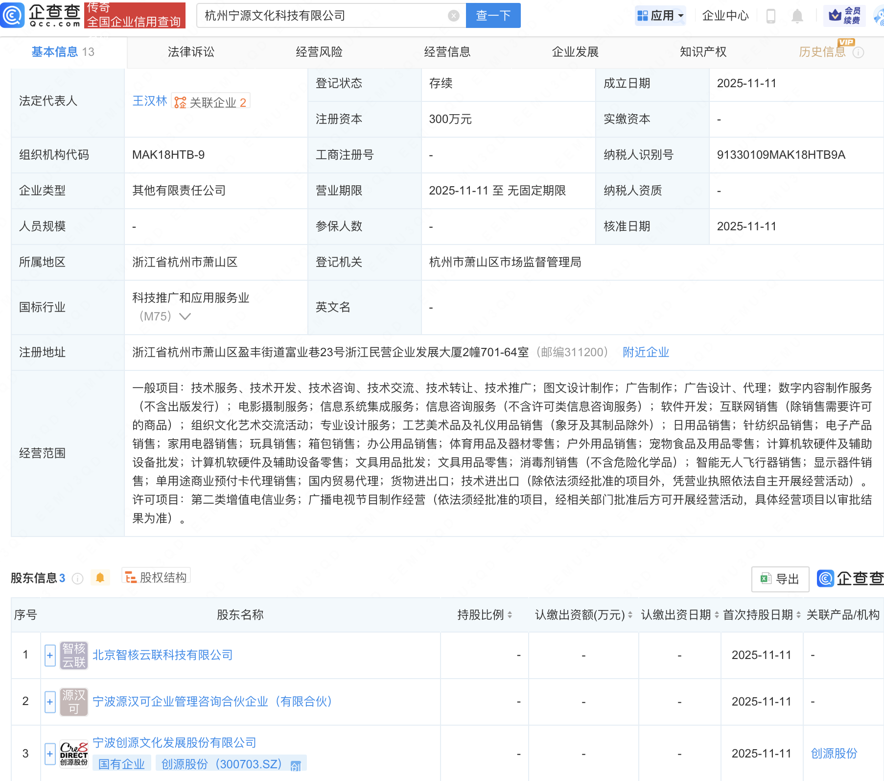 企查查APP显示,近日,杭州宁源文化科技有限公司成立,法定代表人为王汉林,经营范围包含:智能无人飞行器销售;显示器件销售;单用途商业预付卡代理销售等。企查查股权穿透显示,该公司由创源股份(300703)等共同持股。