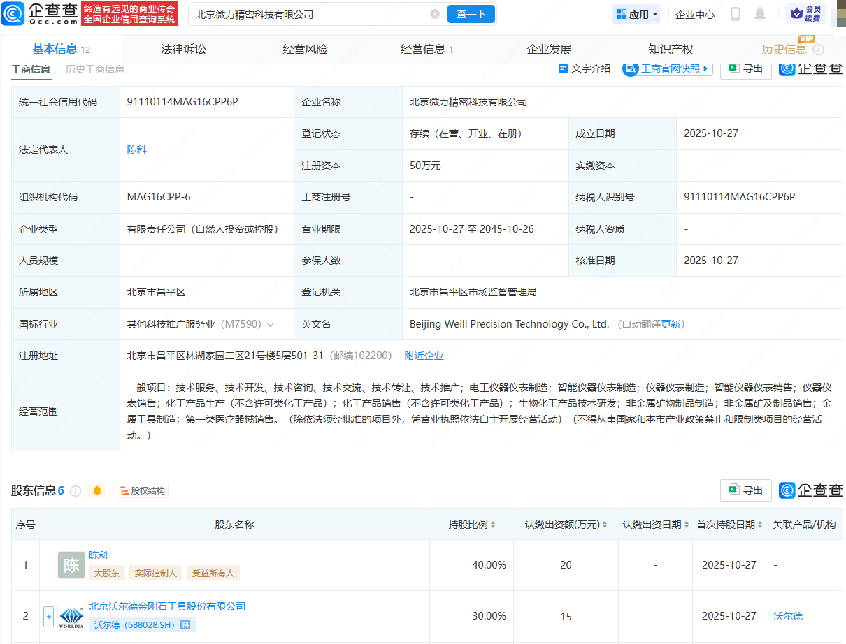企查查APP显示,近日,北京微力精密科技有限公司成立,法定代表人为陈科,经营范围包含:智能仪器仪表制造;仪器仪表制造;智能仪器仪表销售;仪器仪表销售;生物化工产品技术研发等。企查查股权穿透显示,该公司由陈科、沃尔德(688028)等共同持股。