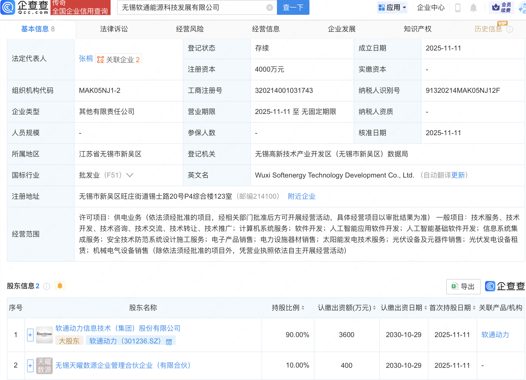 企查查APP显示,近日,无锡软通能源科技发展有限公司成立,注册资本4000万元,经营范围包含:人工智能应用软件开发;人工智能基础软件开发;信息系统集成服务;安全技术防范系统设计施工服务等。企查查股权穿透显示,该公司由软通动力(301236)等共同持股。