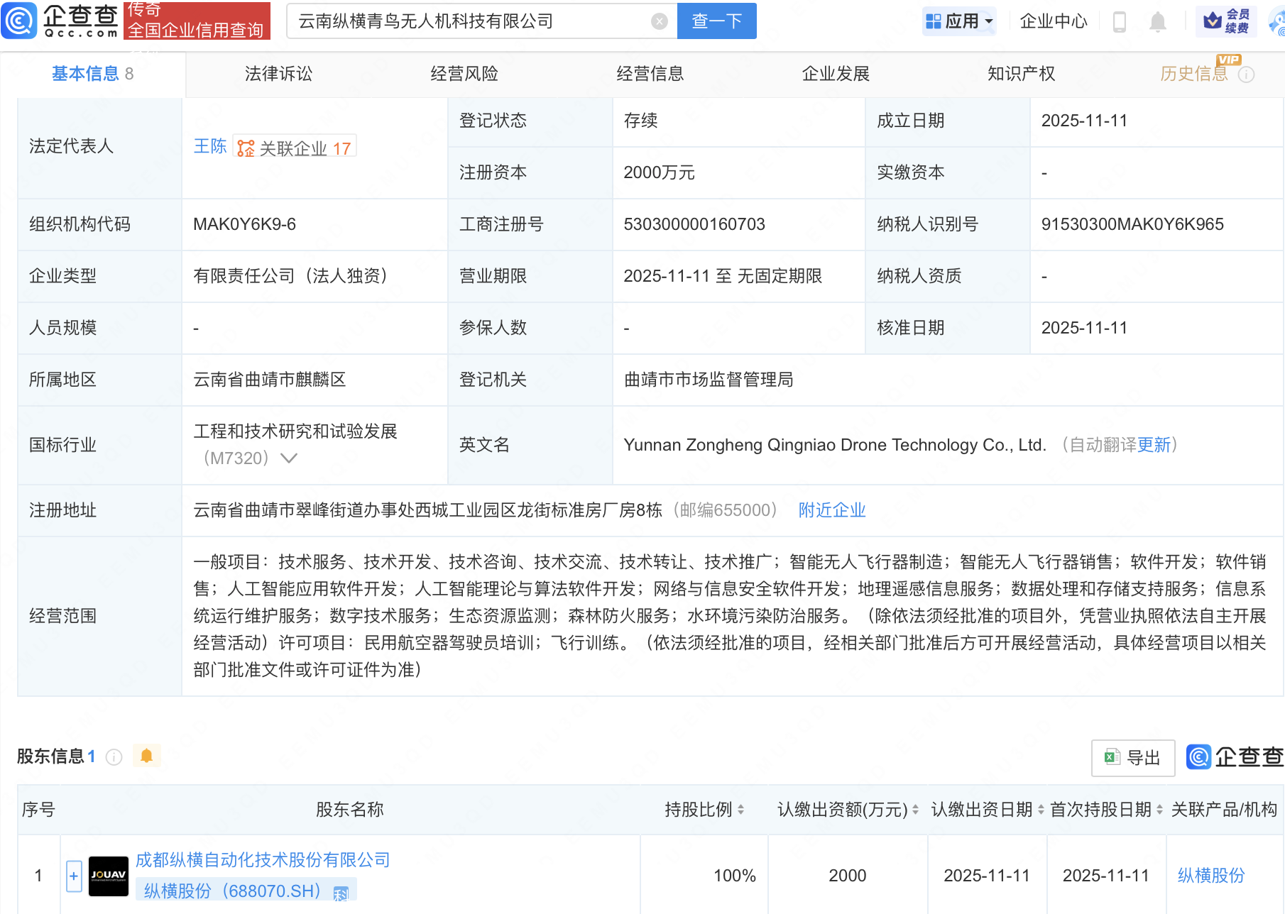 企查查APP显示,近日,云南纵横青鸟无人机科技有限公司成立,注册资本2000万元,经营范围包含:人工智能理论与算法软件开发;网络与信息安全软件开发;地理遥感信息服务;数据处理和存储支持服务等。企查查股权穿透显示,该公司由纵横股份(688070)全资持股。