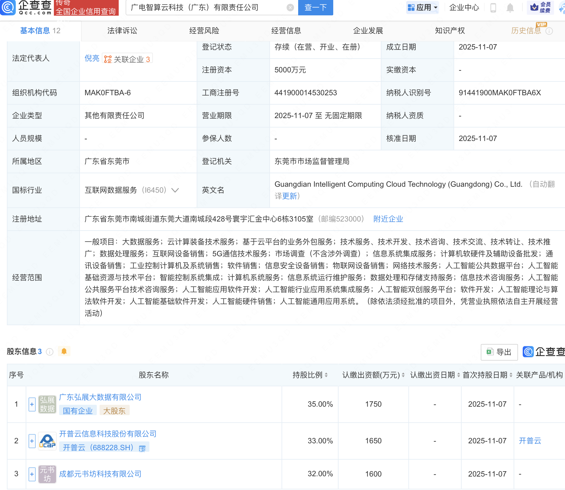 企查查APP显示,近日,广电智算云科技(广东)有限责任公司成立,注册资本5000万元,经营范围包含:人工智能公共服务平台技术咨询服务;人工智能应用软件开发;人工智能行业应用系统集成服务;人工智能双创服务平台等。企查查股权穿透显示,该公司由开普云(688228)等共同持股。