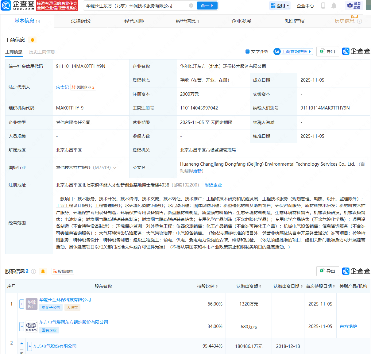 企查查APP显示,近日,华能长江东方(北京)环保技术服务有限公司成立,法定代表人为宋太纪,注册资本为2000万元,经营范围包含:工程管理服务;水环境污染防治服务;水污染治理;固体废物治理;环保咨询服务;新材料技术研发等。企查查股权穿透显示,该公司由华能长江环保科技有限公司、东方电气(600875)控股东方电气集团东方锅炉股份有限公司共同持股。