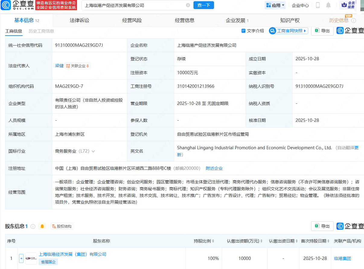 企查查APP显示,近日,上海临港产促经济发展有限公司成立,法定代表人为梁健,注册资本为1亿元,经营范围包含:企业管理;企业管理咨询;创业空间服务;园区管理服务;市场主体登记注册代理;贸易经纪等。企查查股权穿透显示,该公司由上海临港经济发展(集团)有限公司全资持股。