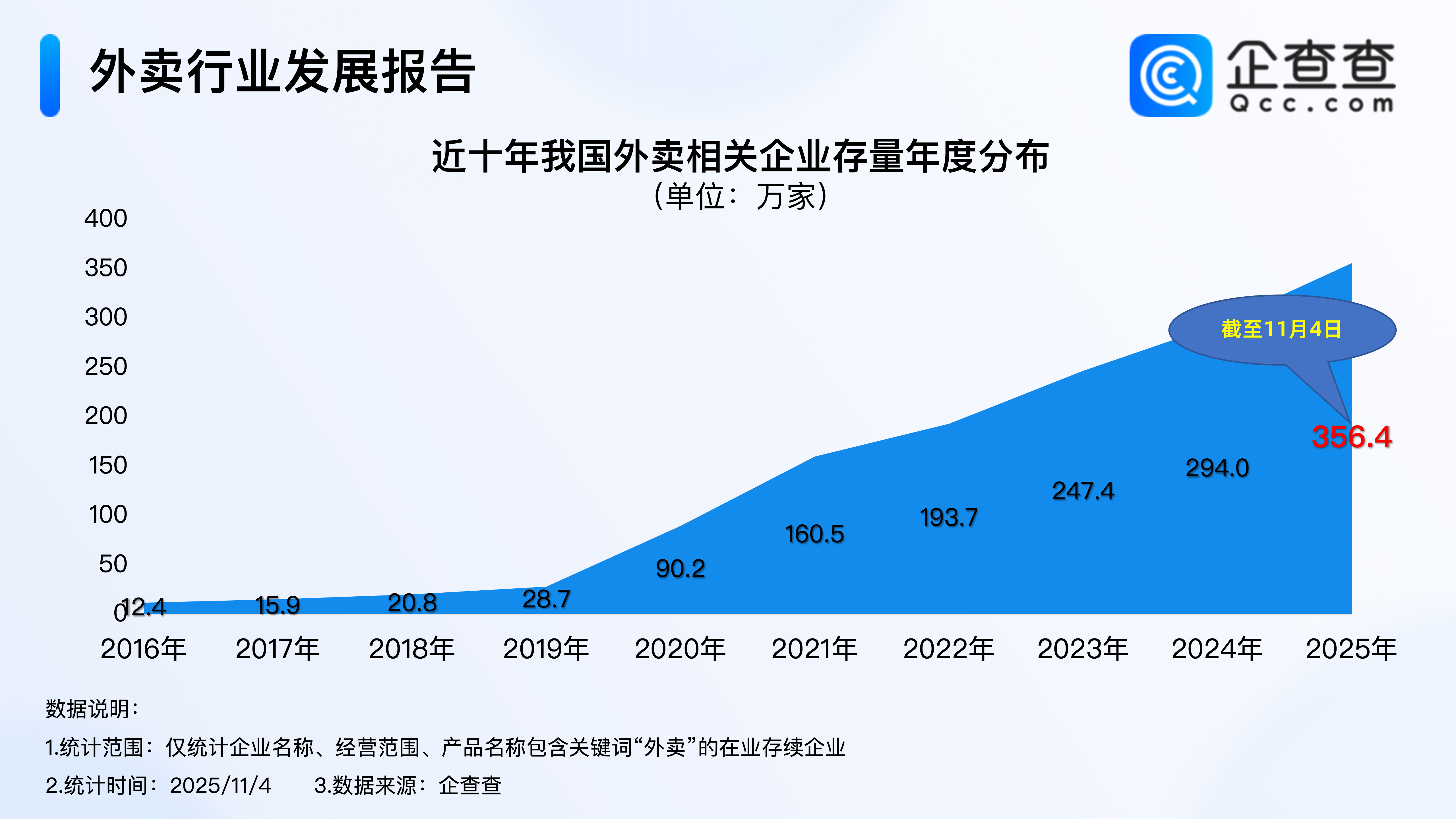 根据企查查数据,我国外卖相关企业存量逐年稳步增加,并于2023年首次突破200万家,截至11月4日,我国现存356.4万家外卖相关企业,接近2020年存量的4倍。
