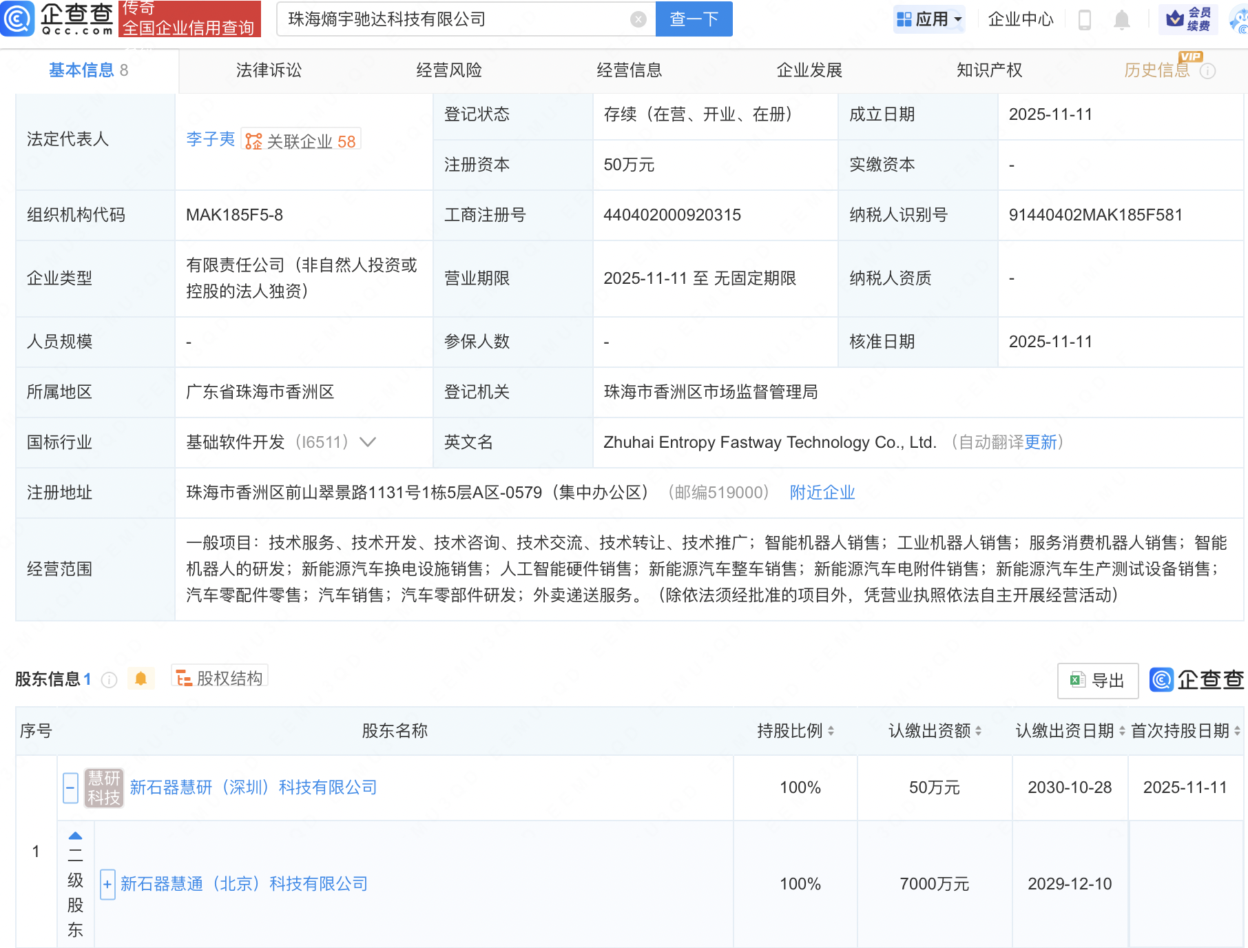 企查查APP显示,近日,珠海熵宇驰达科技有限公司成立,经营范围包含:智能机器人销售;工业机器人销售;智能机器人的研发;新能源汽车换电设施销售;人工智能硬件销售等。企查查股权穿透显示,该公司由新石器慧通(北京)科技有限公司间接全资持股。