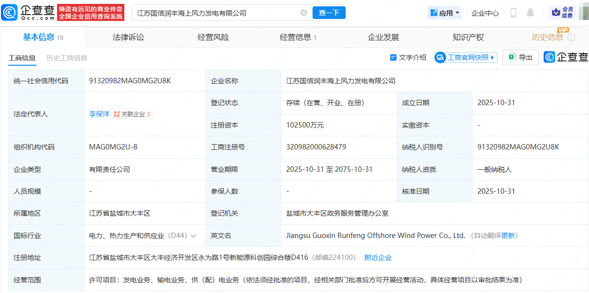 企查查APP显示,近日,江苏国信润丰海上风力发电有限公司成立,法定代表人为李保洋,注册资本为10.25亿元,经营范围包含:发电业务、输电业务、供(配)电业务。企查查股权穿透显示,该公司由江苏省国信集团有限公司、金风科技(002202)旗下江苏金风科技有限公司等共同持股。