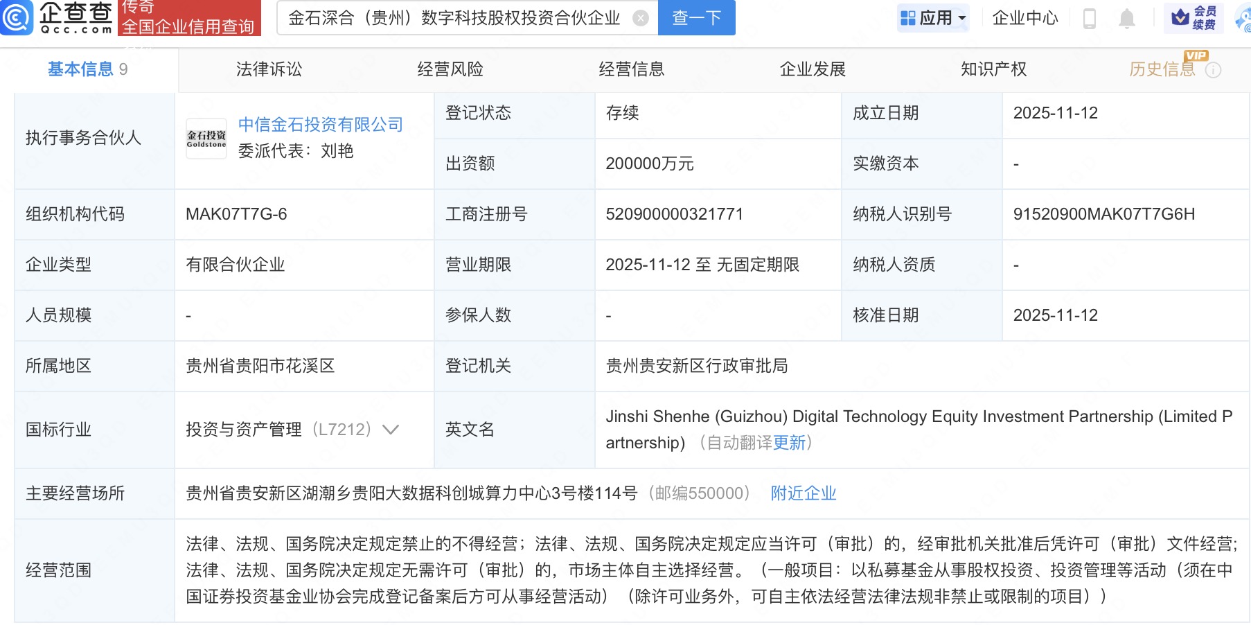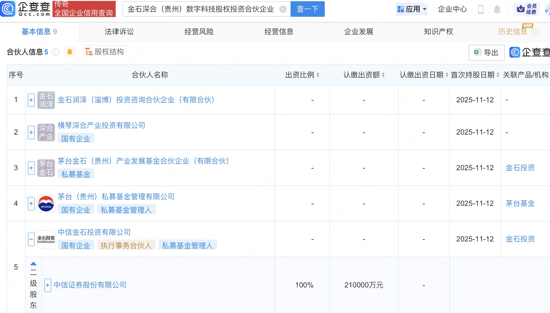 企查查APP显示,近日,金石深合(贵州)数字科技股权投资合伙企业(有限合伙)成立,出资额20亿元,经营范围包含:以私募基金从事股权投资、投资管理等活动。企查查股权穿透显示,该企业由茅台金石(贵州)产业发展基金合伙企业(有限合伙)、茅台(贵州)私募基金管理有限公司、中信证券(600030)全资子公司中信金石投资有限公司等共同出资。