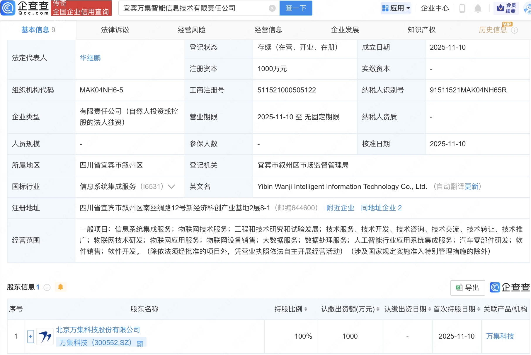 企查查APP显示,近日,宜宾万集智能信息技术有限责任公司成立,注册资本1000万元,经营范围包含:物联网应用服务;物联网设备销售;大数据服务;数据处理服务;人工智能行业应用系统集成服务等。企查查股权穿透显示,该公司由万集科技(300552)全资持股。
