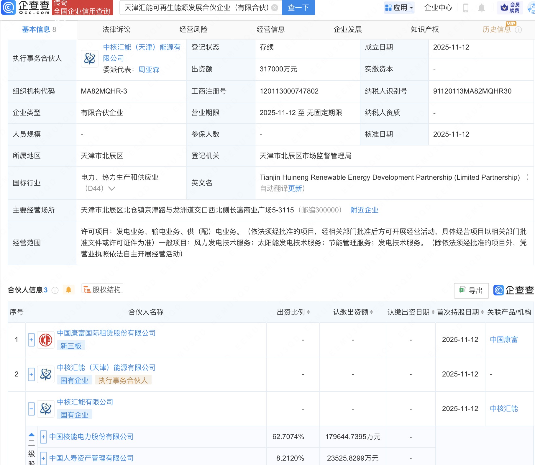 企查查APP显示,近日,天津汇能可再生能源发展合伙企业(有限合伙)成立,出资额31.7亿人民币,经营范围含风力发电技术服务,太阳能发电技术服务,节能管理服务,发电技术服务等。企查查股权穿透显示,该企业由中国康富国际租赁股份有限公司、中国核电(601985)旗下中核汇能有限公司、中核汇能(天津)能源有限公司共同出资。
