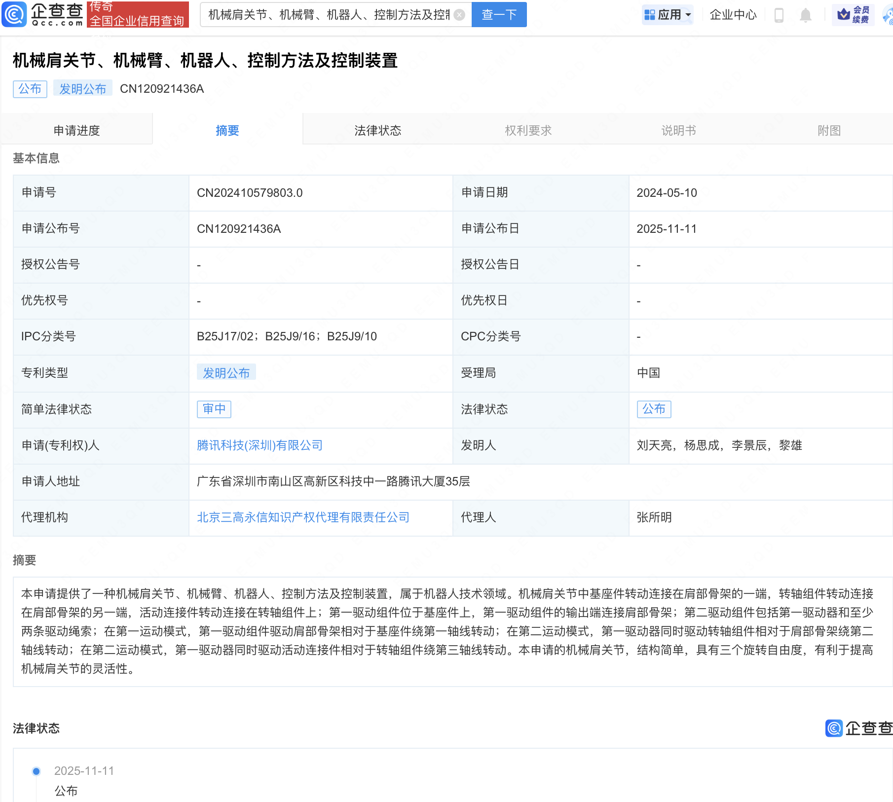 腾讯公布机械肩关节、机械臂、机器人相关专利