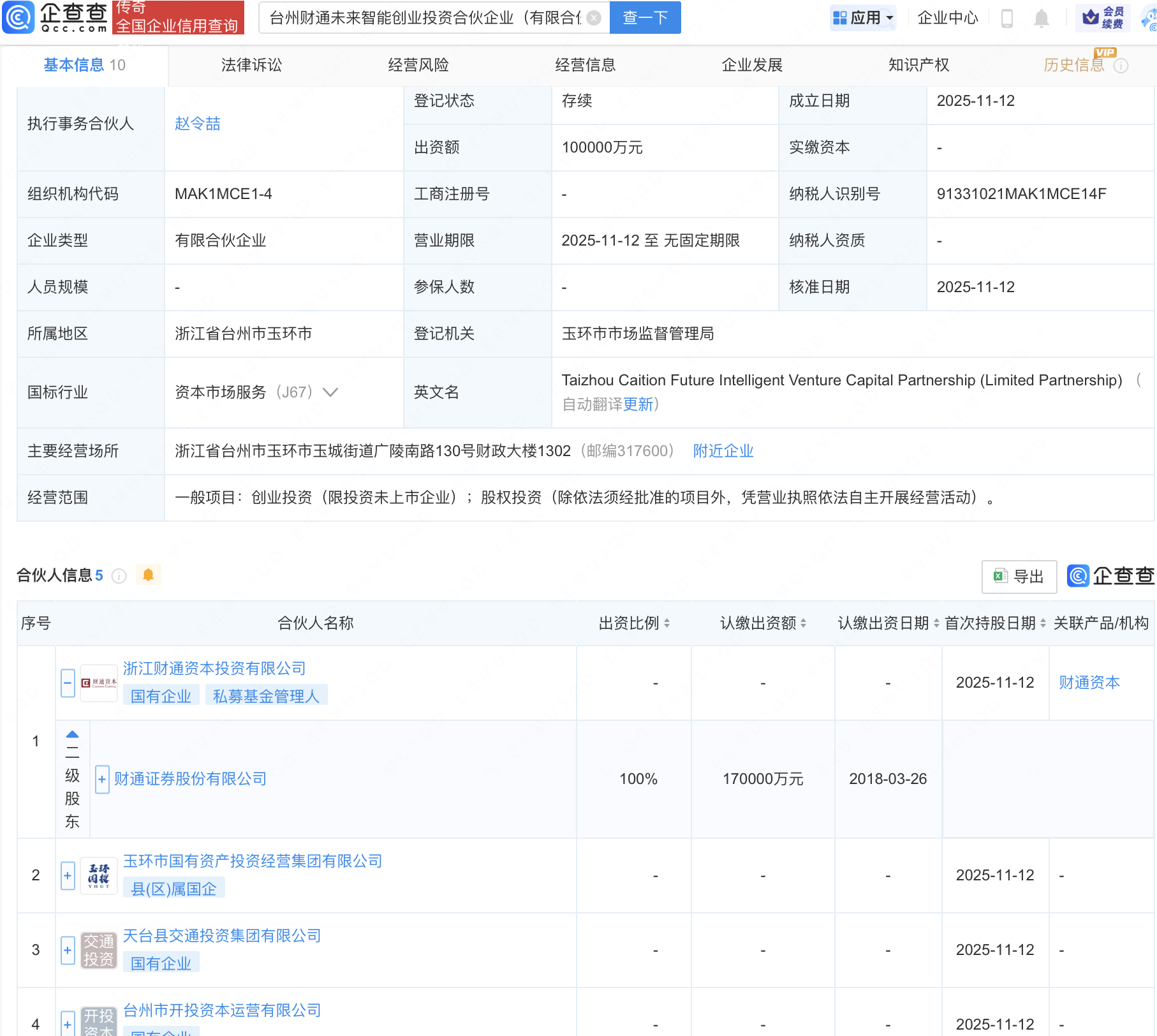 企查查APP显示,近日,台州财通未来智能创业投资合伙企业(有限合伙)成立,出资额10亿元,经营范围包含:创业投资(限投资未上市企业);股权投资。企查查股权穿透显示,该企业由财通证券(601108)全资子公司浙江财通资本投资有限公司等共同出资。