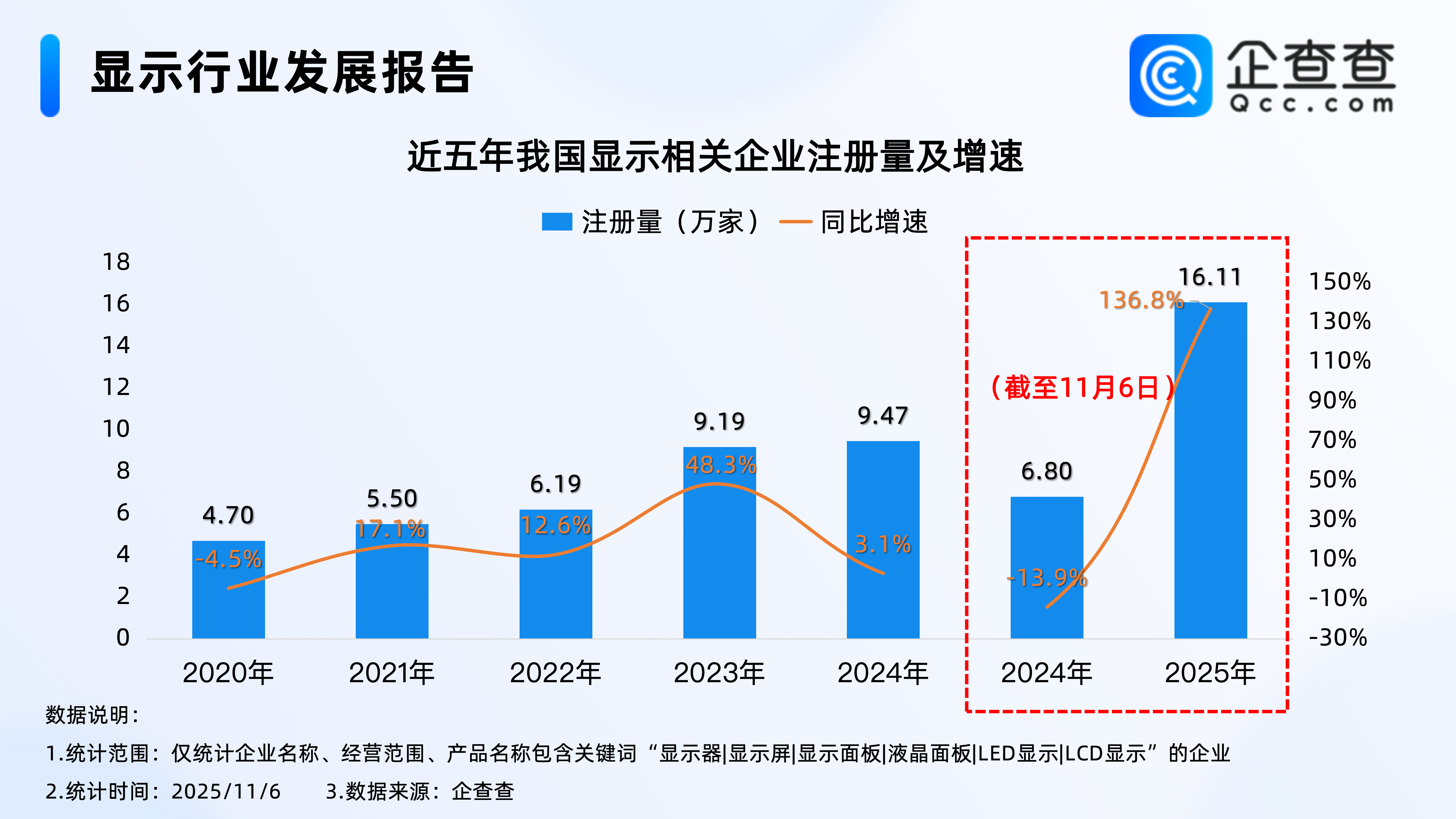 企查查数据显示,2020年以来,我国显示相关企业每年注册量逐年增加至2024年的9.47万家,2025年以来,我国显示相关企业注册量激增,截至11月6日,我国今年已注册16.11万家相关企业,相比2024年同期大幅增加136.8%。