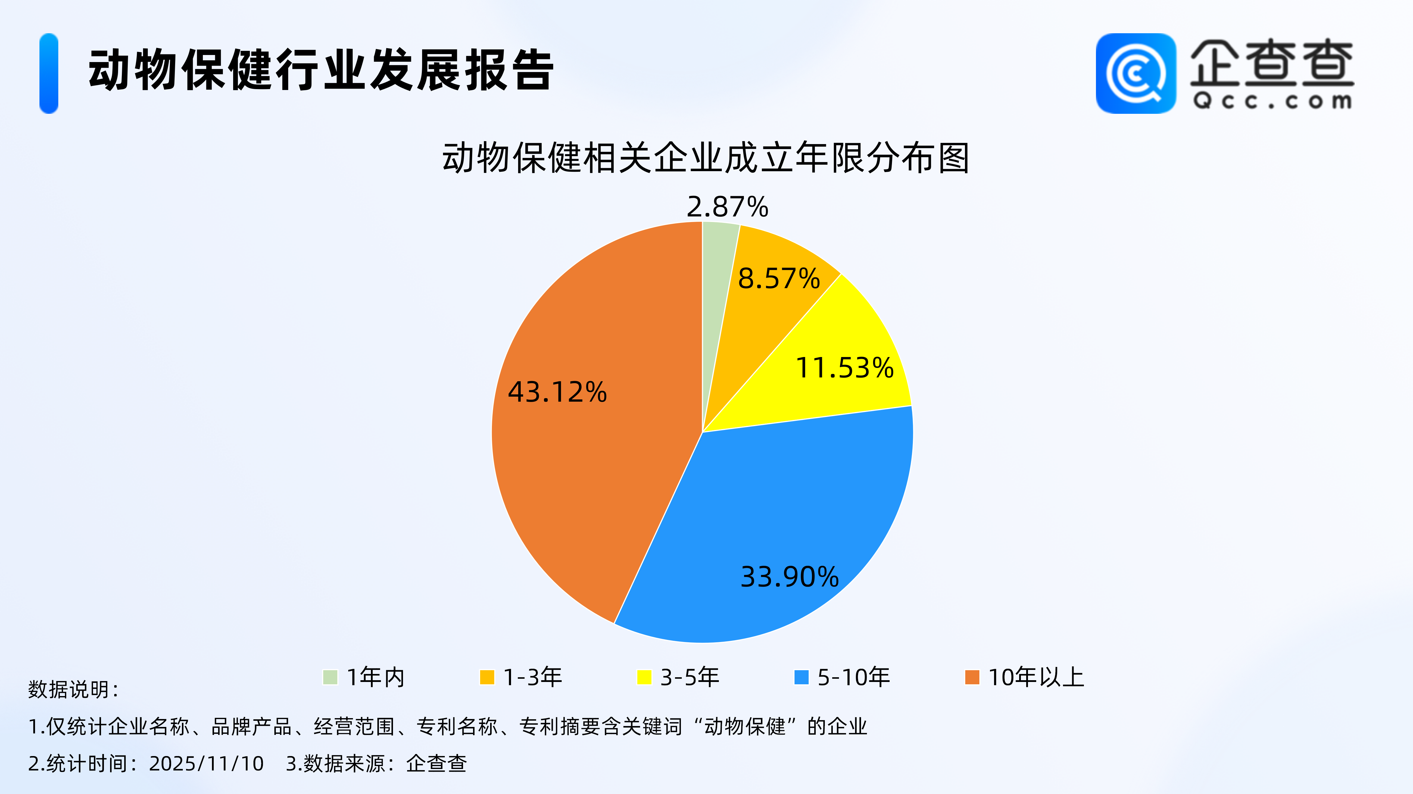 企查查数据显示,截至11月10日,国内现存动物保健相关企业3302家。从经营时间来看,动物保健相关企业多为老牌企业,成立年限在10年以上的企业最多,占比43.12%。其次,成立年限在5-10年的相关企业占比33.90%。注册量方面,2024年全年注册动物保健相关企业121家,截至目前,今年已注册83家。