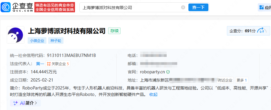 企查查显示,上海萝博派对科技有限公司为RoboParty关联公司,成立于2025年2月,法定代表人为黄一,现由上海萝博特企业管理咨询合伙企业(有限合伙)等及上述新增股东共同持股。官网显示,RoboParty是一家专注于人形机器人的科技公司。