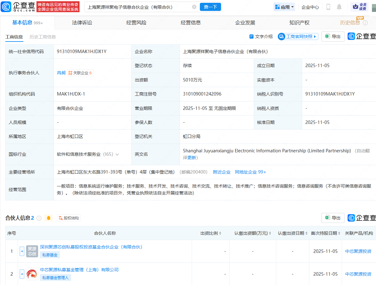 企查查APP显示,近日,上海聚源祥聚电子信息合伙企业(有限合伙)成立,出资额5010万元,经营范围包含:信息系统运行维护服务;信息技术咨询服务;信息咨询服务(不含许可类信息咨询服务)等。企查查股权穿透显示,该合伙企业由深圳聚源芯创私募股权投资基金合伙企业(有限合伙)、中芯聚源私募基金管理(上海)有限公司共同持股。