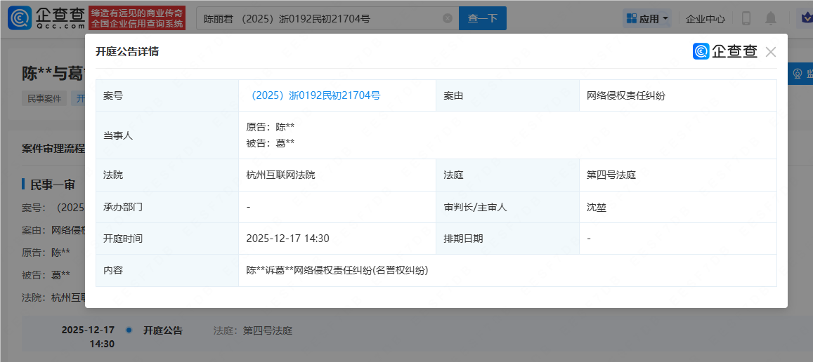 企查查APP显示,近日,法院刊登陈丽君起诉葛某某网络侵权责任纠纷(名誉权纠纷)开庭公告。据悉,该案件计划将于12月17日,在杭州互联网法院开庭审理。