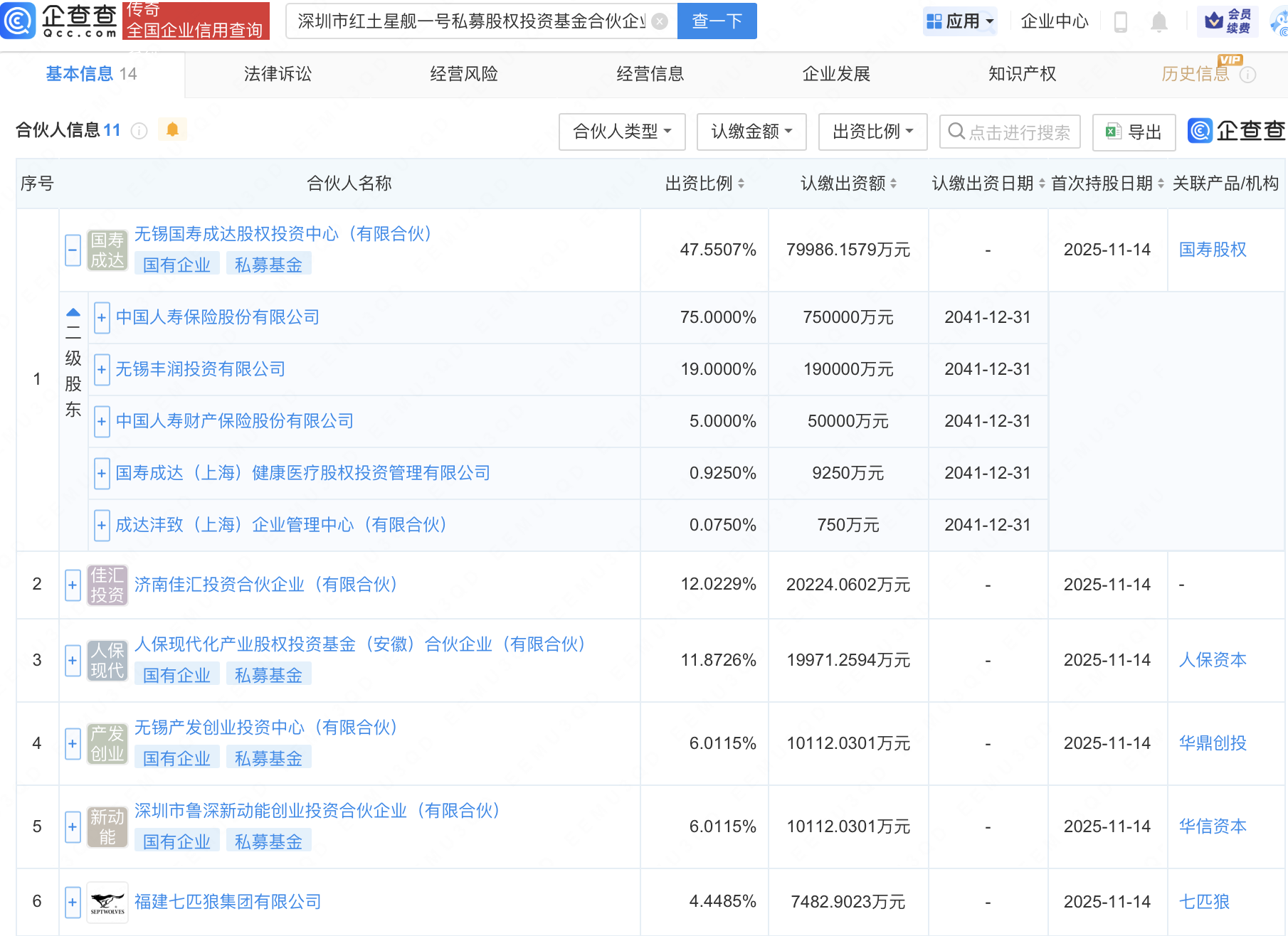 企查查APP显示,近日,深圳市红土星舰一号私募股权投资基金合伙企业(有限合伙)成立,出资额约16.82亿元,经营范围包含:以私募基金从事股权投资、投资管理、资产管理等活动。企查查股权穿透显示,该企业由中国人寿(601628)旗下无锡国寿成达股权投资中心(有限合伙)、人保现代化产业股权投资基金(安徽)合伙企业(有限合伙)、福建七匹狼集团有限公司等共同出资。
