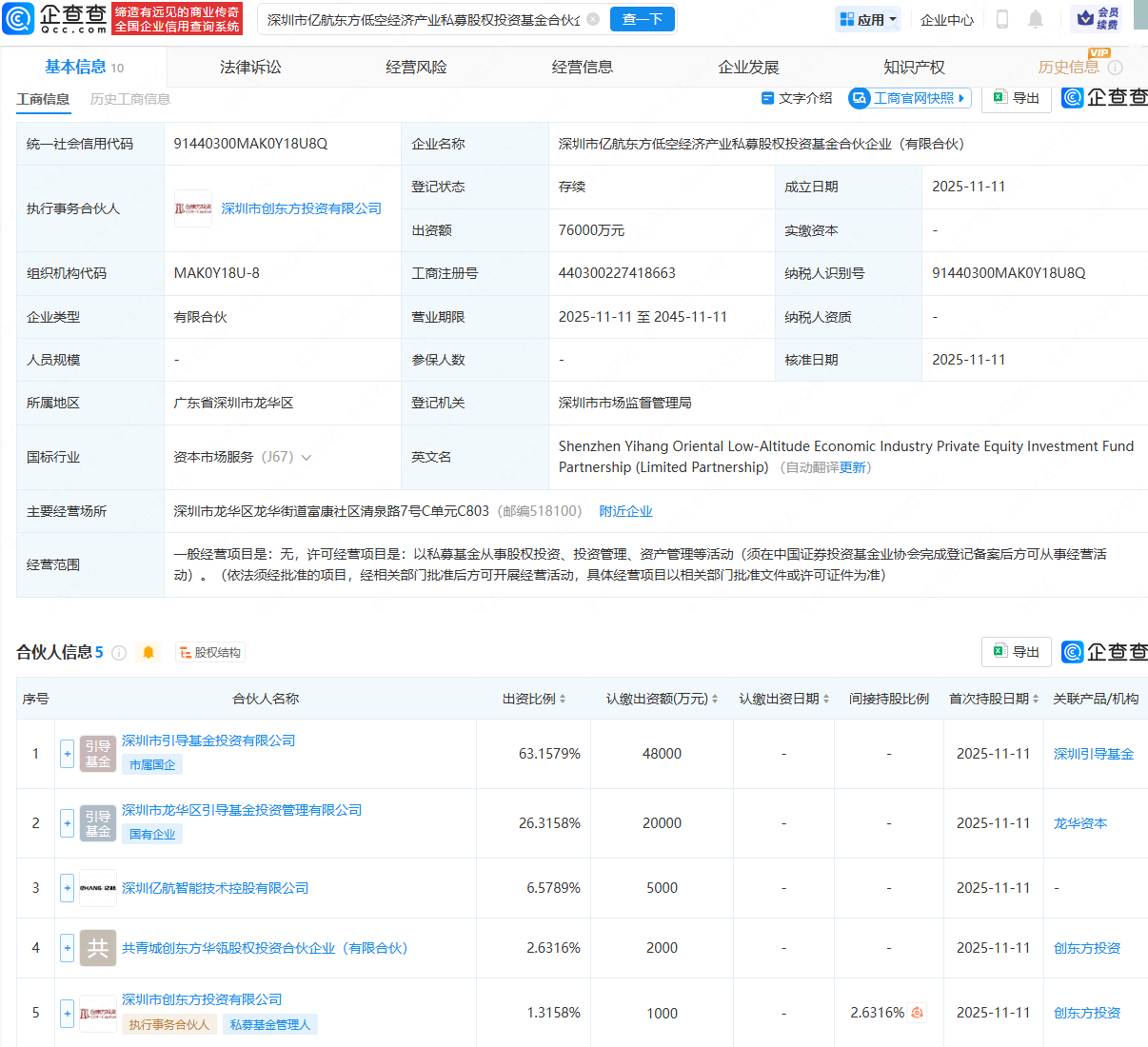 企查查APP显示,近日,深圳市亿航东方低空经济产业私募股权投资基金合伙企业(有限合伙)成立,出资额7.6亿元,经营范围包含:以私募基金从事股权投资、投资管理、资产管理等活动。企查查股权穿透显示,该合伙企业由深圳市引导基金投资有限公司、深圳市龙华区引导基金投资管理有限公司等共同持股。