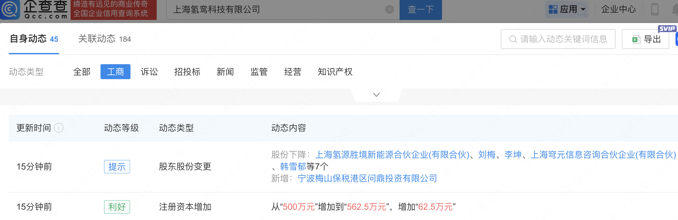 企查查APP显示,近日,上海氢鸾科技有限公司发生工商变更,新增宁德时代(300750)全资子公司宁波梅山保税港区问鼎投资有限公司为股东,同时注册资本增至562.5万元。企查查信息显示,该公司成立于2016年,法定代表人为刘梅,经营范围包含:光伏设备及元器件销售;电子专用材料研发;新兴能源技术研发;储能技术服务等。据其官网,氢鸾科技专注于阴离子交换膜(AEM)电解水制氢技术。