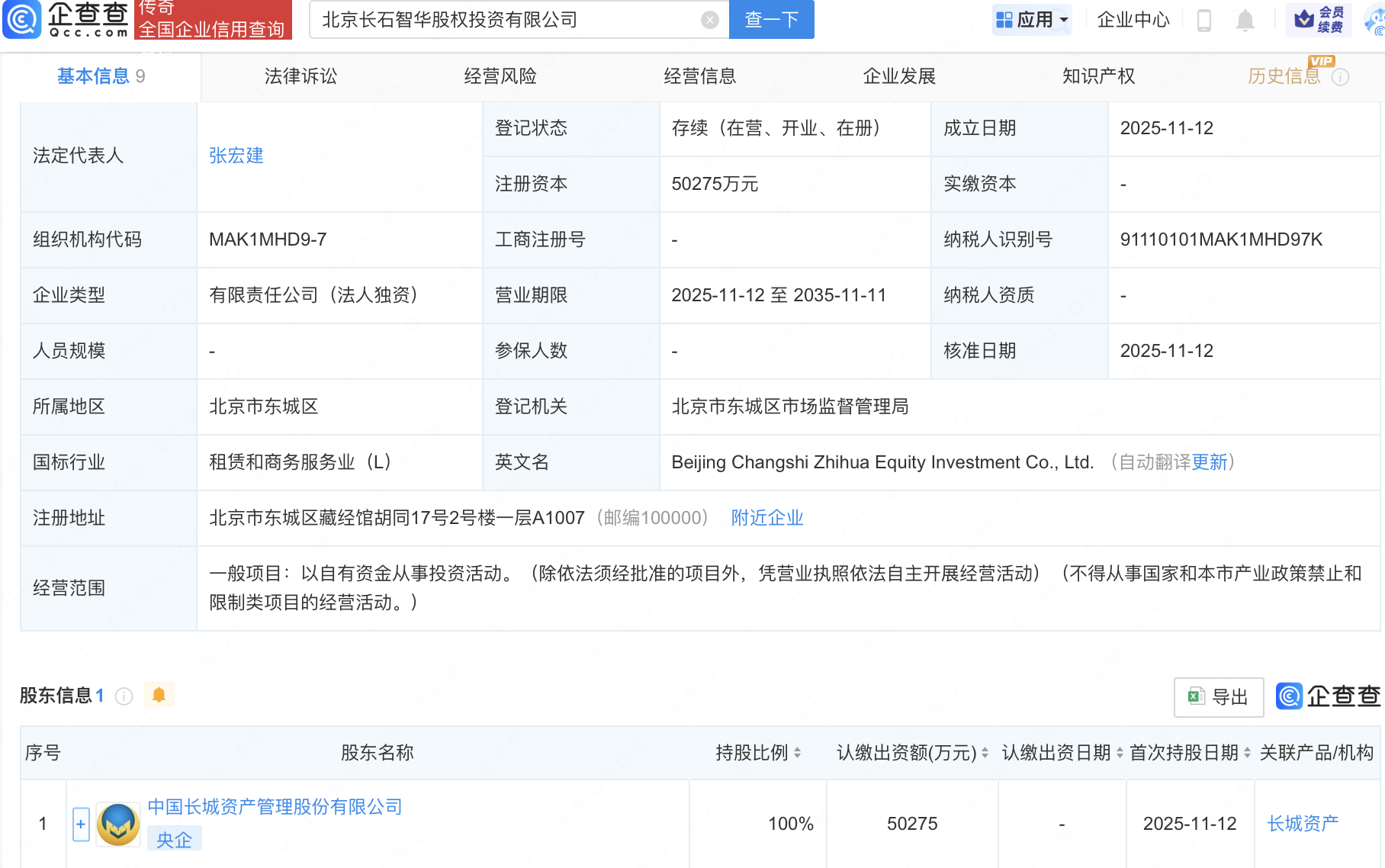 企查查APP显示,近日,北京长石智华股权投资有限公司成立,注册资本约5.03亿元,经营范围包含:以自有资金从事投资活动。企查查股权穿透显示,该公司由中国长城资产管理股份有限公司全资持股。