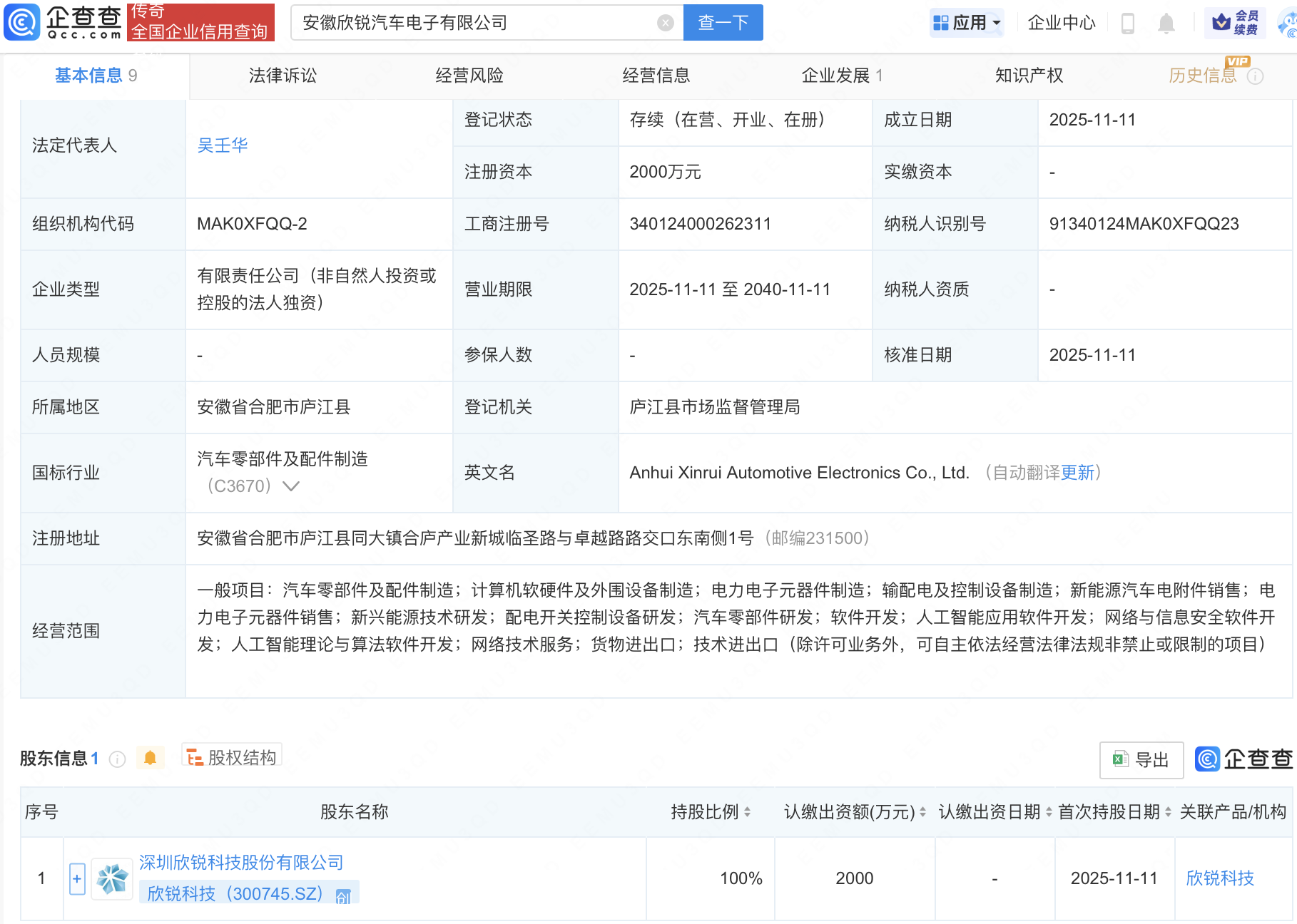 企查查APP显示,近日,安徽欣锐汽车电子有限公司成立,注册资本2000万元,经营范围包含:人工智能应用软件开发;网络与信息安全软件开发;人工智能理论与算法软件开发;网络技术服务等。企查查股权穿透显示,该公司由欣锐科技(300745)全资持股。