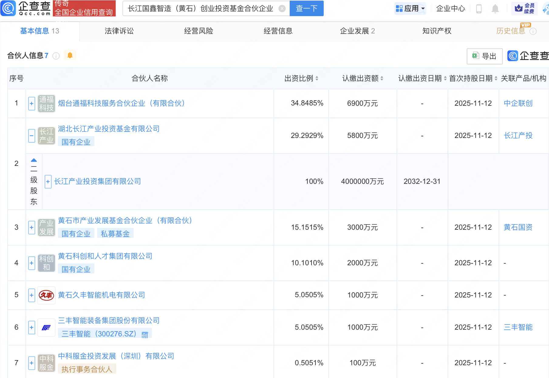 企查查APP显示,近日,长江国鑫智造(黄石)创业投资基金合伙企业(有限合伙)成立,出资额2亿元,经营范围包含:创业投资(限投资未上市企业);以自有资金从事投资活动;私募股权投资基金管理、创业投资基金管理服务。企查查股权穿透显示,该企业由长江产业投资集团有限公司全资子公司湖北长江产业投资基金有限公司、三丰智能(300276)等共同出资。