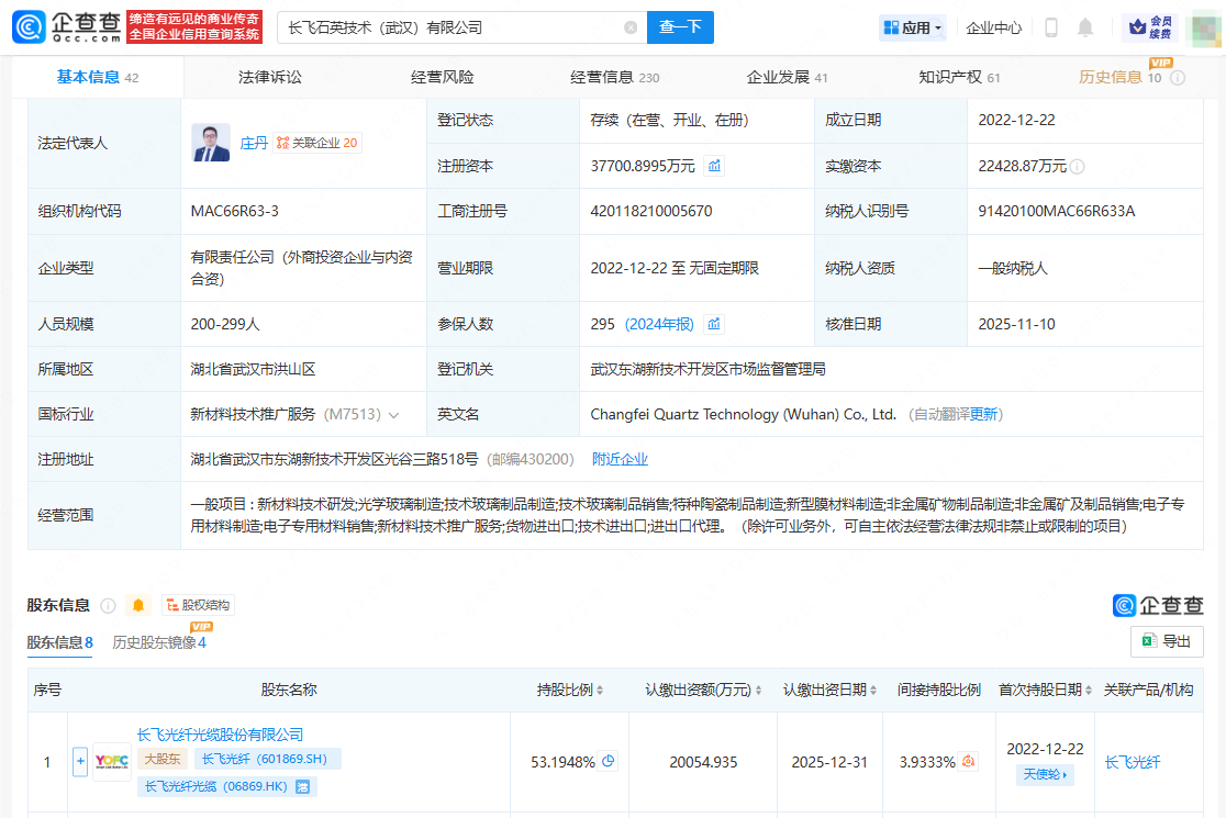 企查查APP显示,近日,长飞光纤(601869)旗下长飞石英技术(武汉)有限公司发生工商变更,注册资本由约2.74亿人民币增至约3.77亿人民币,新增国家大基金三期旗下国投集新(北京)股权投资基金(有限合伙)、湖北省长飞天使创业投资基金合伙企业(有限合伙)、长春长兴长光创业投资合伙企业(有限合伙)为股东。企查查信息显示,长飞石英技术(武汉)有限公司成立于2022年12月,法定代表人为庄丹,经营范围涉及新材料技术研发、光学玻璃制造、技术玻璃制品制造、技术玻璃制品销售等。