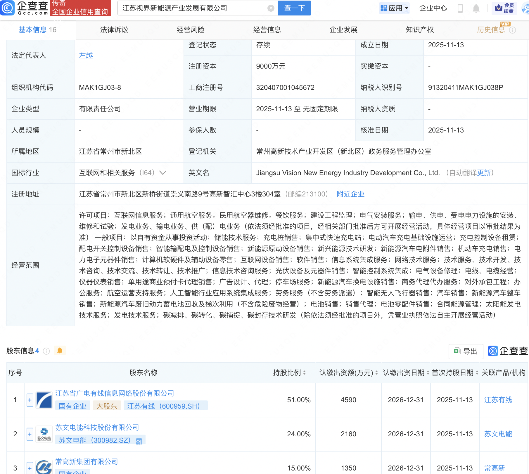 企查查APP显示,近日,江苏视界新能源产业发展有限公司成立,注册资本9000万元,经营范围包含:人工智能行业应用系统集成服务;智能无人飞行器销售;汽车销售;新能源汽车整车销售等。企查查股权穿透显示,该公司由江苏有线(600959)、苏文电能(300982)等共同持股。