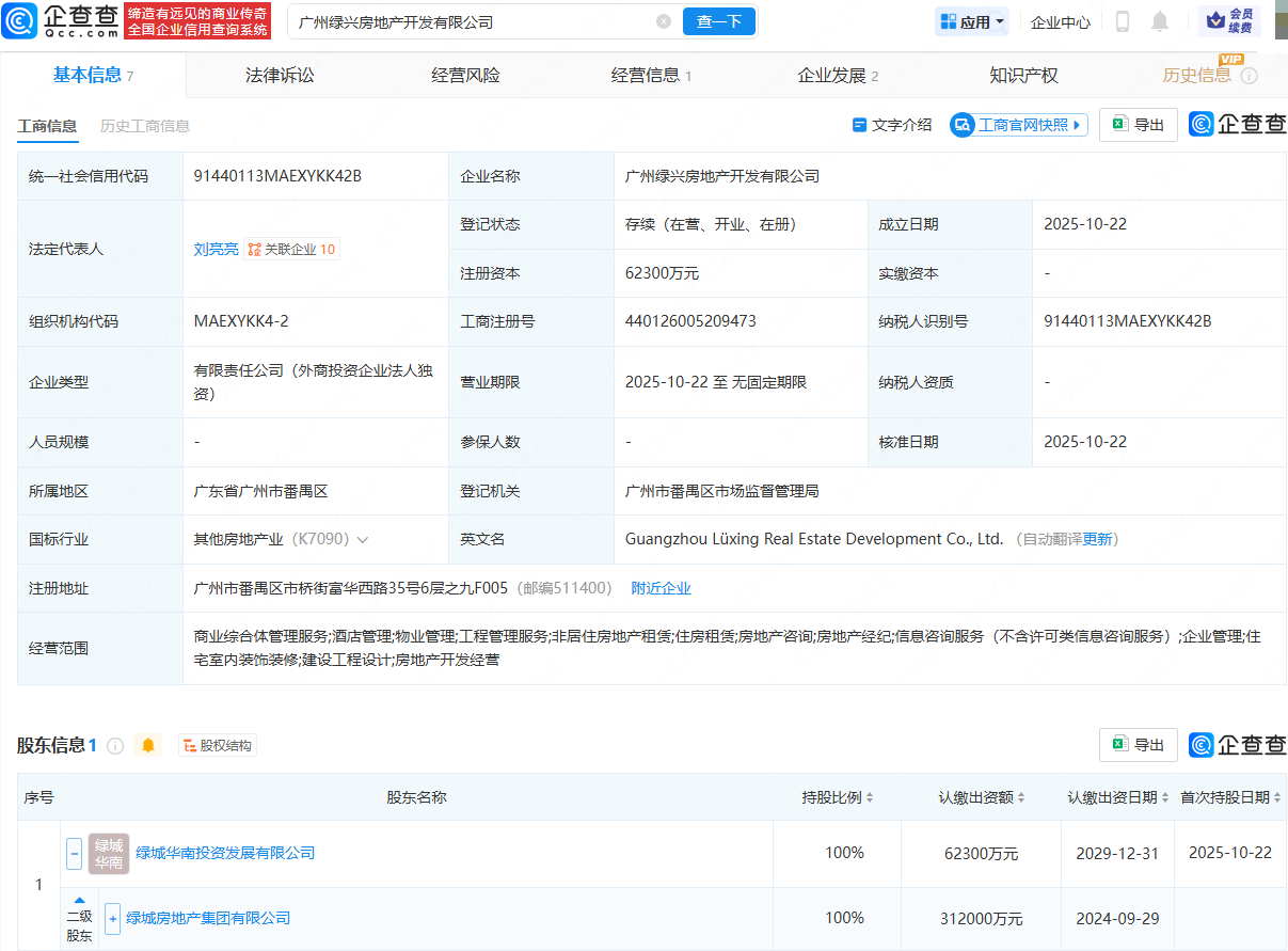 企查查APP显示,近日,广州绿兴房地产开发有限公司成立,法定代表人为刘亮亮,注册资本为6.23亿元,经营范围包含:商业综合体管理服务;酒店管理;物业管理;工程管理服务;住房租赁;房地产经纪等。企查查股权穿透显示,该公司由绿城房地产集团有限公司间接全资持股。