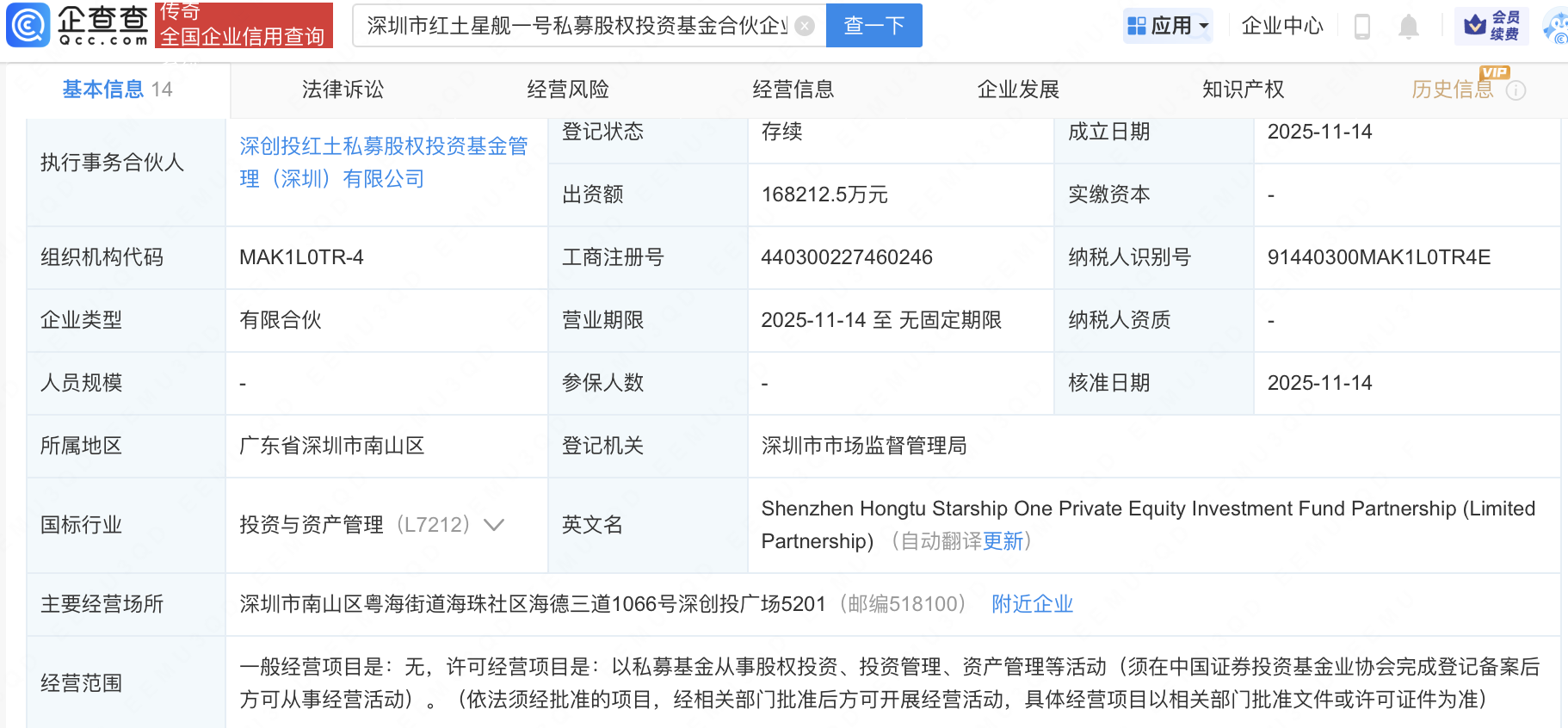企查查APP显示,近日,深圳市红土星舰一号私募股权投资基金合伙企业(有限合伙)成立,出资额约16.82亿元,经营范围包含:以私募基金从事股权投资、投资管理、资产管理等活动。企查查股权穿透显示,该企业由中国人寿(601628)旗下无锡国寿成达股权投资中心(有限合伙)、人保现代化产业股权投资基金(安徽)合伙企业(有限合伙)、福建七匹狼集团有限公司等共同出资。
