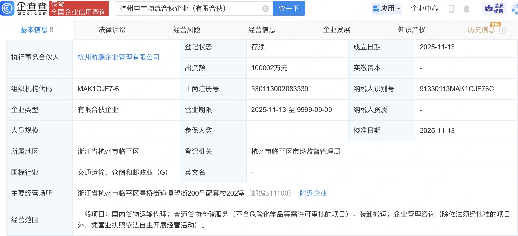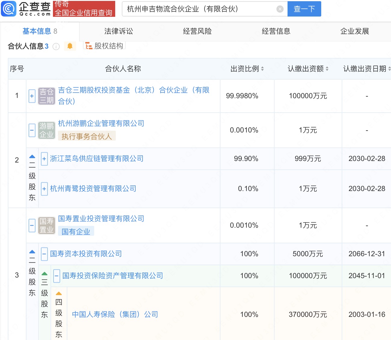 企查查APP显示,近日,杭州申吉物流合伙企业(有限合伙)成立,出资额约10亿元,经营范围包含:国内货物运输代理;普通货物仓储服务(不含危险化学品等需许可审批的项目);装卸搬运;企业管理咨询。企查查股权穿透显示,该企业由浙江菜鸟供应链管理有限公司旗下杭州游鹏企业管理有限公司、中国人寿保险(集团)公司旗下国寿置业投资管理有限公司、吉仓三期股权投资基金(北京)合伙企业(有限合伙)共同出资。