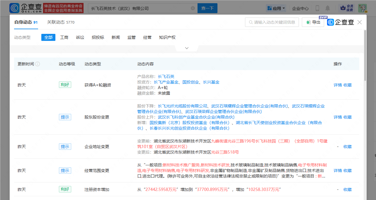 企查查APP显示,近日,长飞光纤(601869)旗下长飞石英技术(武汉)有限公司发生工商变更,注册资本由约2.74亿人民币增至约3.77亿人民币,新增国家大基金三期旗下国投集新(北京)股权投资基金(有限合伙)、湖北省长飞天使创业投资基金合伙企业(有限合伙)、长春长兴长光创业投资合伙企业(有限合伙)为股东。企查查信息显示,长飞石英技术(武汉)有限公司成立于2022年12月,法定代表人为庄丹,经营范围涉及新材料技术研发、光学玻璃制造、技术玻璃制品制造、技术玻璃制品销售等。