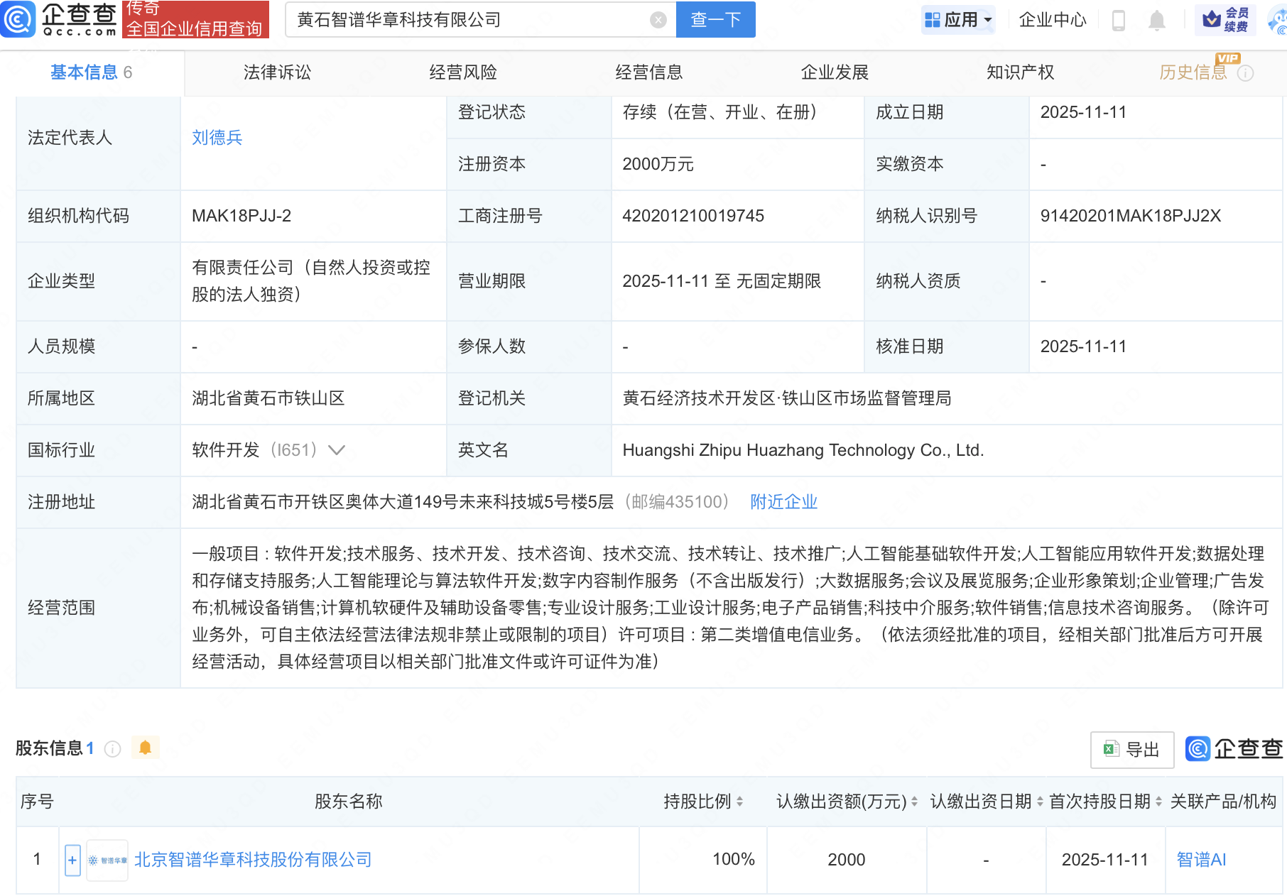 企查查APP显示,近日,黄石智谱华章科技有限公司成立,注册资本2000万元,经营范围包含:人工智能基础软件开发;人工智能应用软件开发;数据处理和存储支持服务;人工智能理论与算法软件开发等。企查查股权穿透显示,该公司由智谱AI关联公司北京智谱华章科技股份有限公司全资持股。