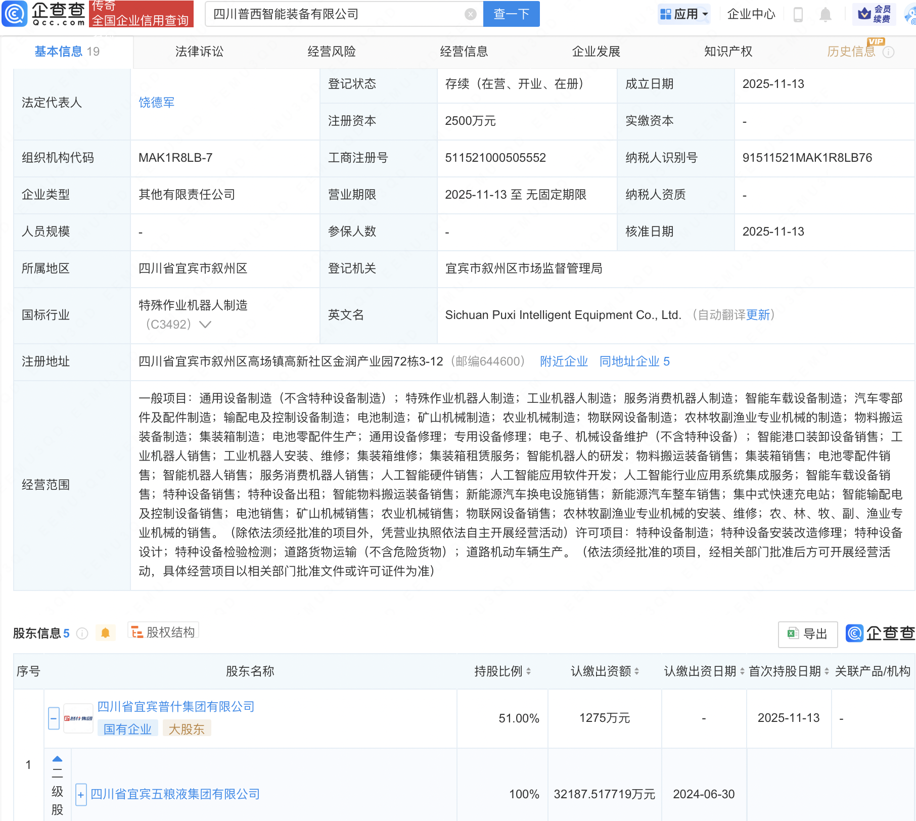 企查查APP显示,近日,四川普西智能装备有限公司成立,注册资本2500万元,经营范围包含:智能机器人的研发;智能机器人销售;人工智能硬件销售;人工智能应用软件开发;人工智能行业应用系统集成服务等。企查查股权穿透显示,该公司由四川省宜宾五粮液集团有限公司全资子公司四川省宜宾普什集团有限公司等共同持股。