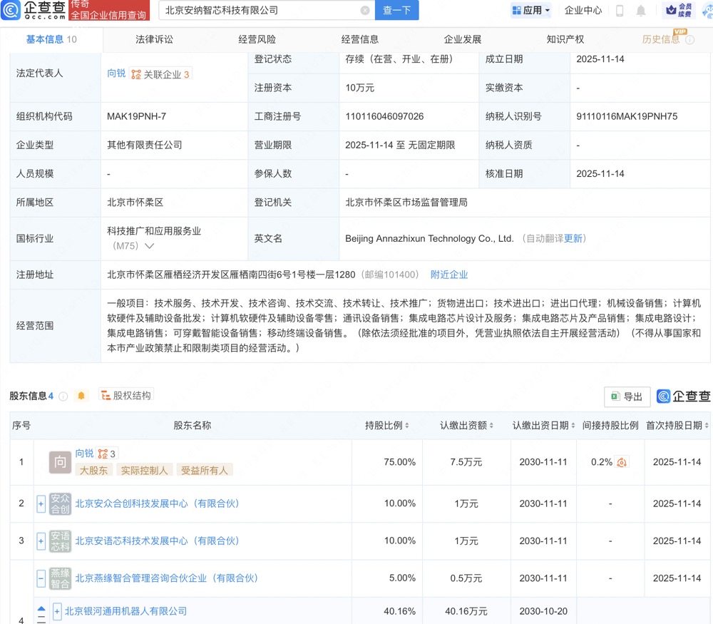 企查查APP显示,近日,北京安纳智芯科技有限公司成立,经营范围包含:集成电路芯片设计及服务;集成电路芯片及产品销售;集成电路设计;集成电路销售等。企查查股权穿透显示,该公司由北京燕缘智合管理咨询合伙企业(有限合伙)等共同持股,后者大股东为北京银河通用机器人有限公司,持股40.16%。